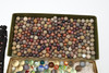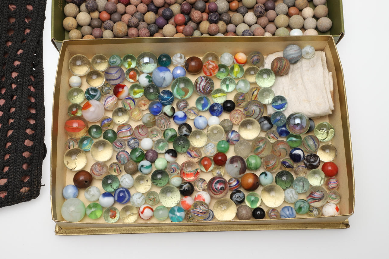 En mängd olika glaskulor inklusive några handblåsta och maskintillverkade kulor. Inklusive latticino-kulor, färgade glaskulor, gröna glaskulor, keramikkulor etc.