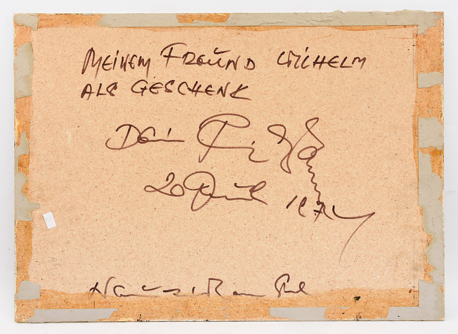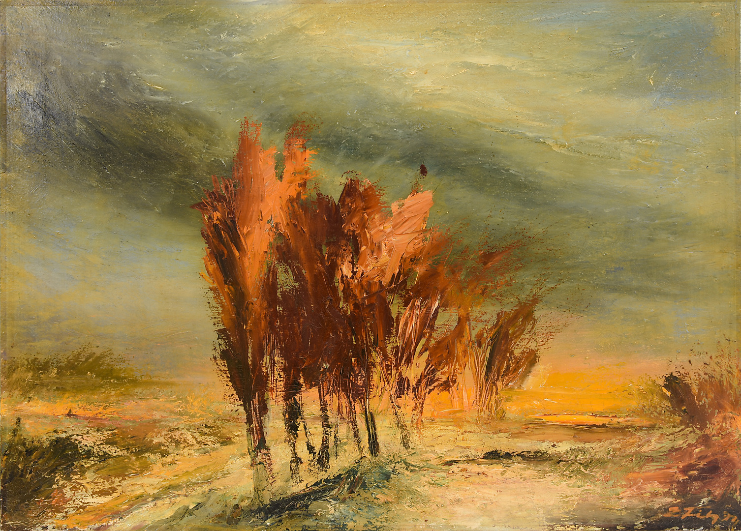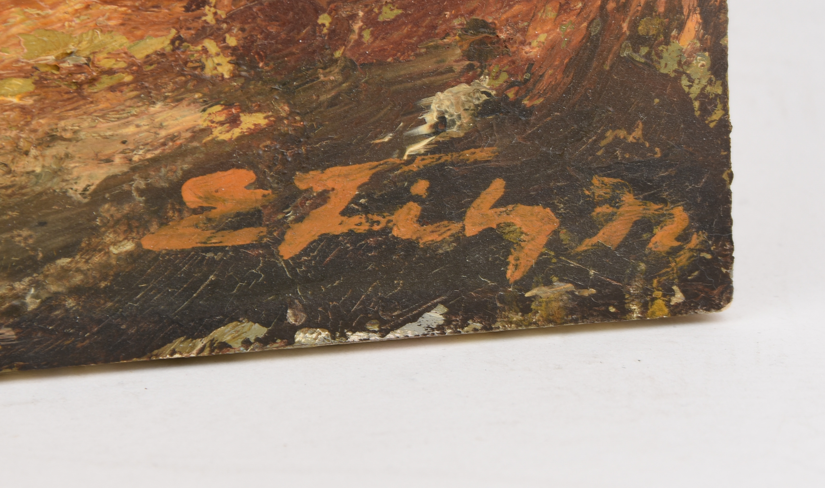 367759. UNBEKANNTER KÜNSTLER. ”Träd”, blandteknik på tallrik, skylt.