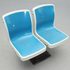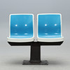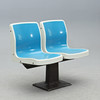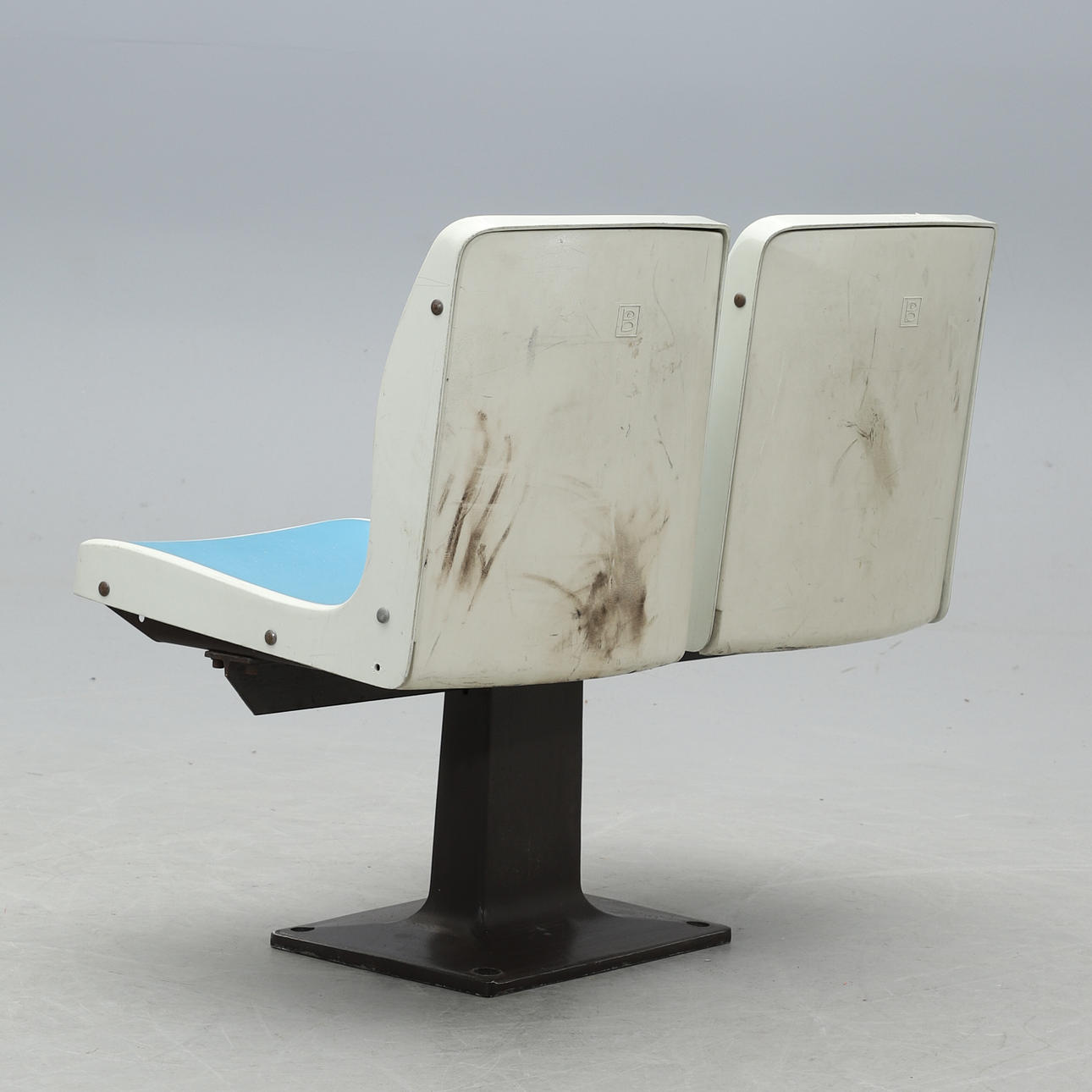 Stativ av järn med sitsar av plast. Sitthöjd ca 42, rygghöjd 79, bredd 86, djup ca 60 cm.