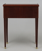 Fanerat i mahogny, tre lådor, en inredd med fack, handtag, listverk och benavslut i mässing. Längd 58, bredd 39, höjd 73 cm.
