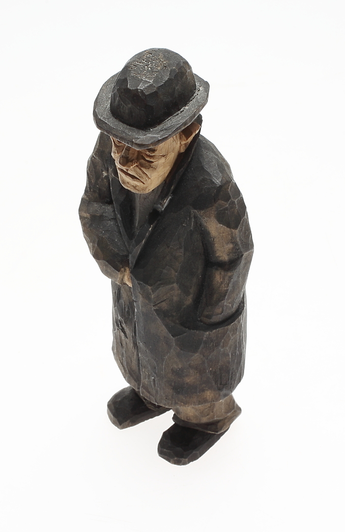 368581. HILMER JOHANSSON. Man med rock, träskulptur, Döderhult,Oskarshamn,1900-talets mitt.