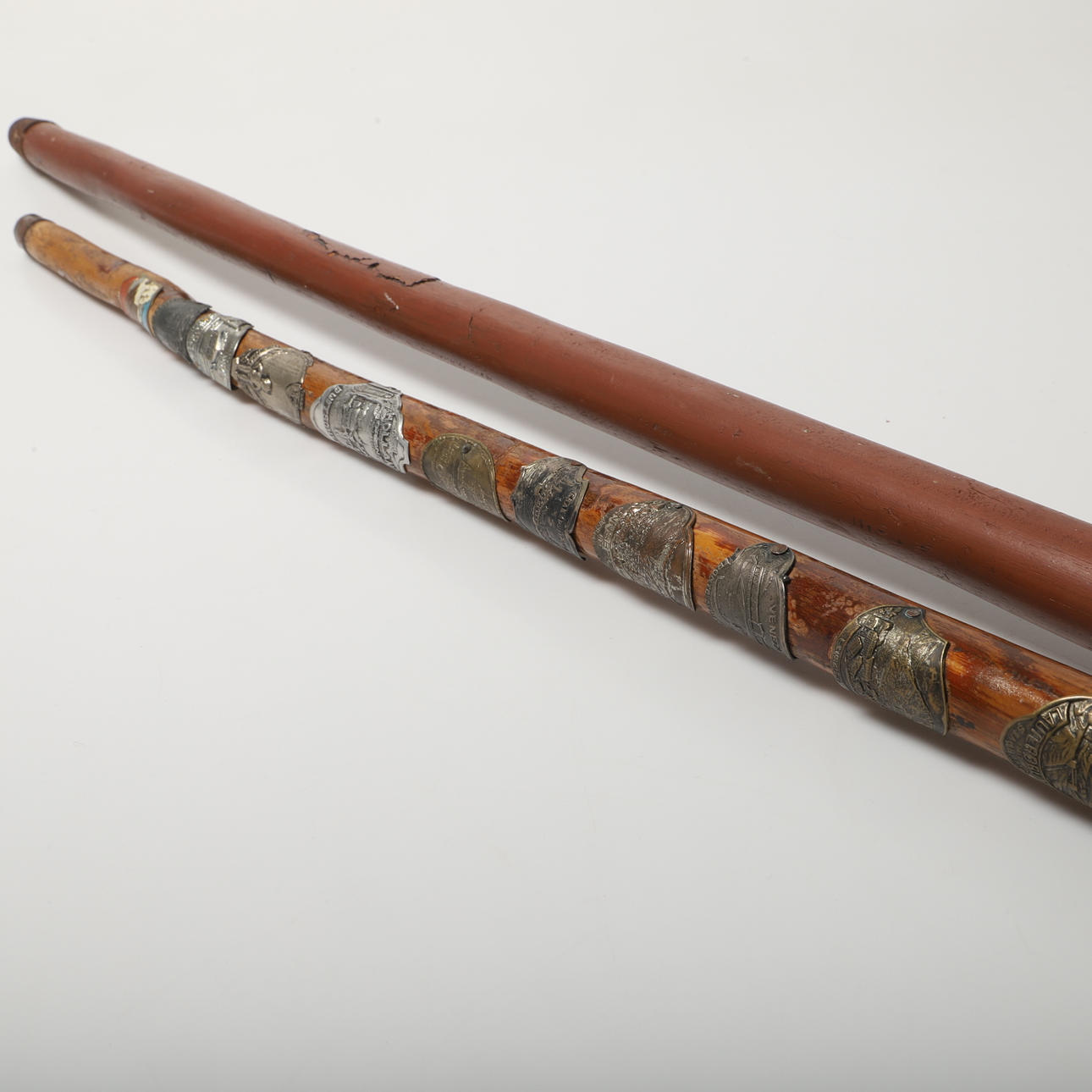 1 vandringskäpp med 16 souvernirmärken från bl. aSchweiz, Tyskland och Frankrike, längd ca 90 cm