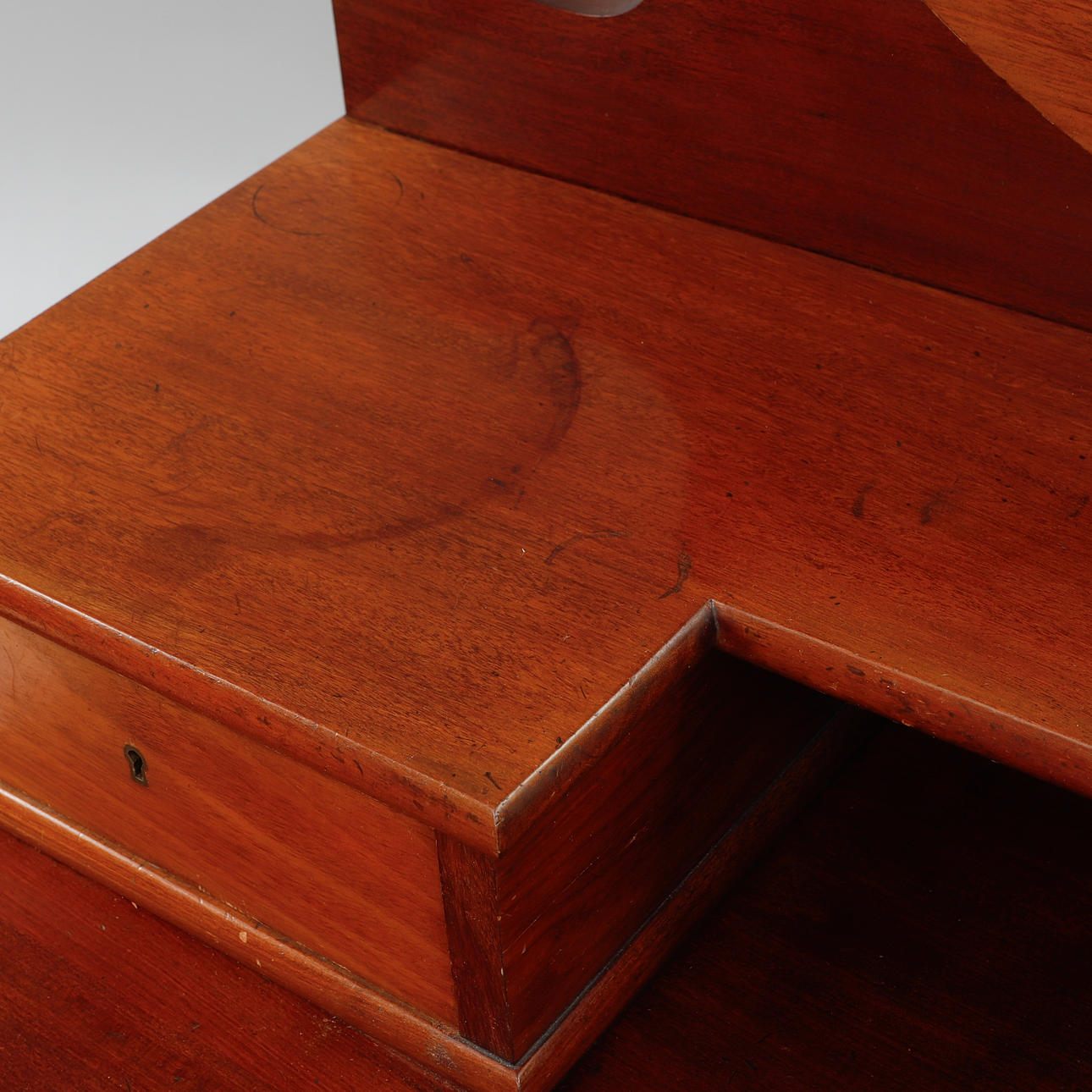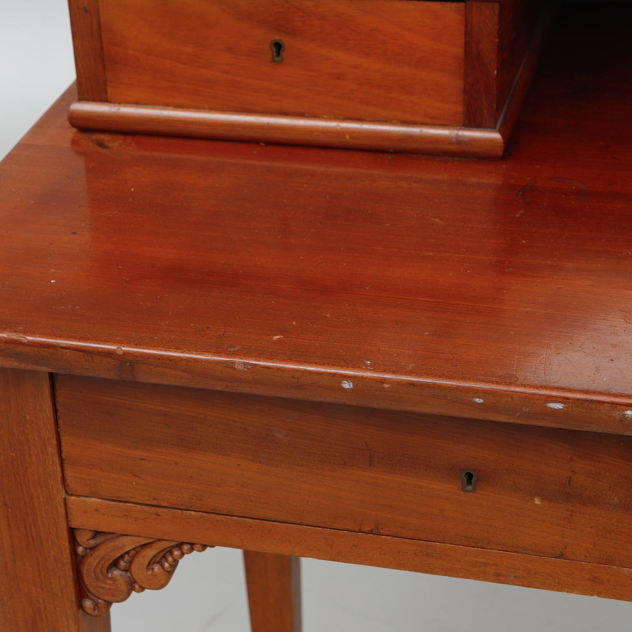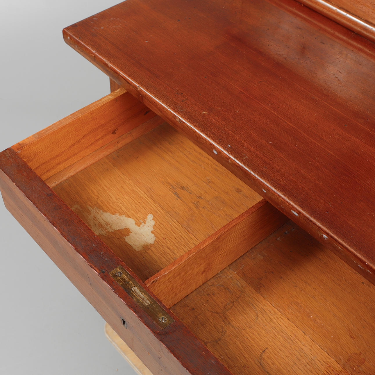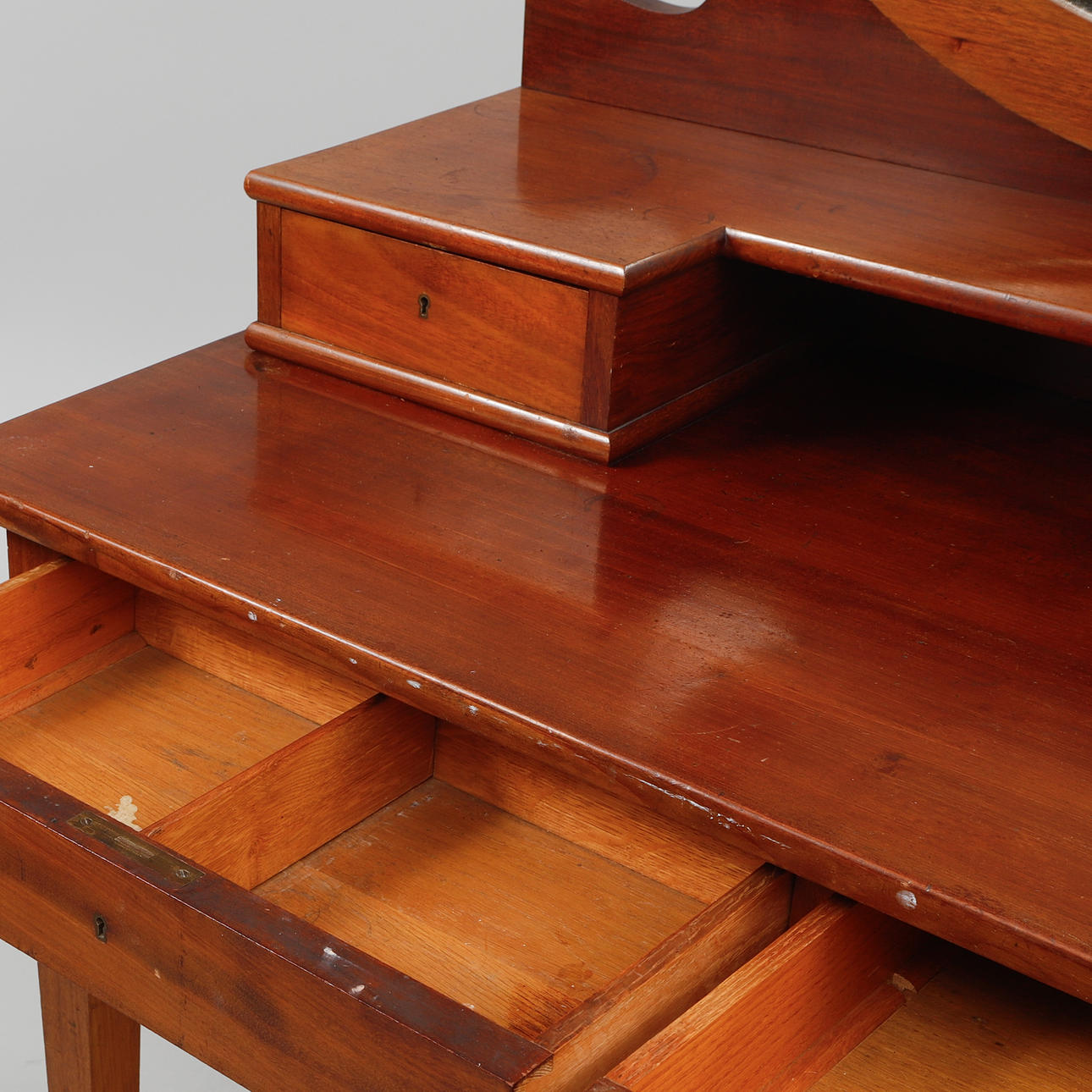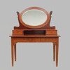 Tvådelad med vikbar spegel, fyra lådor. Längd 120, djup 57, höjd 158 cm.