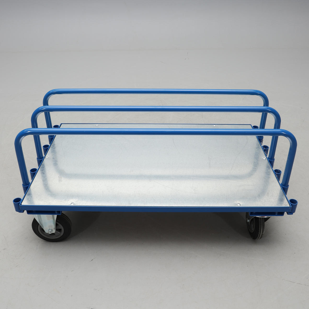 Blålackerad vagn i metall i stabil konstruktion med massiva gummihjul och 3 st avtagbara rörgavlar.