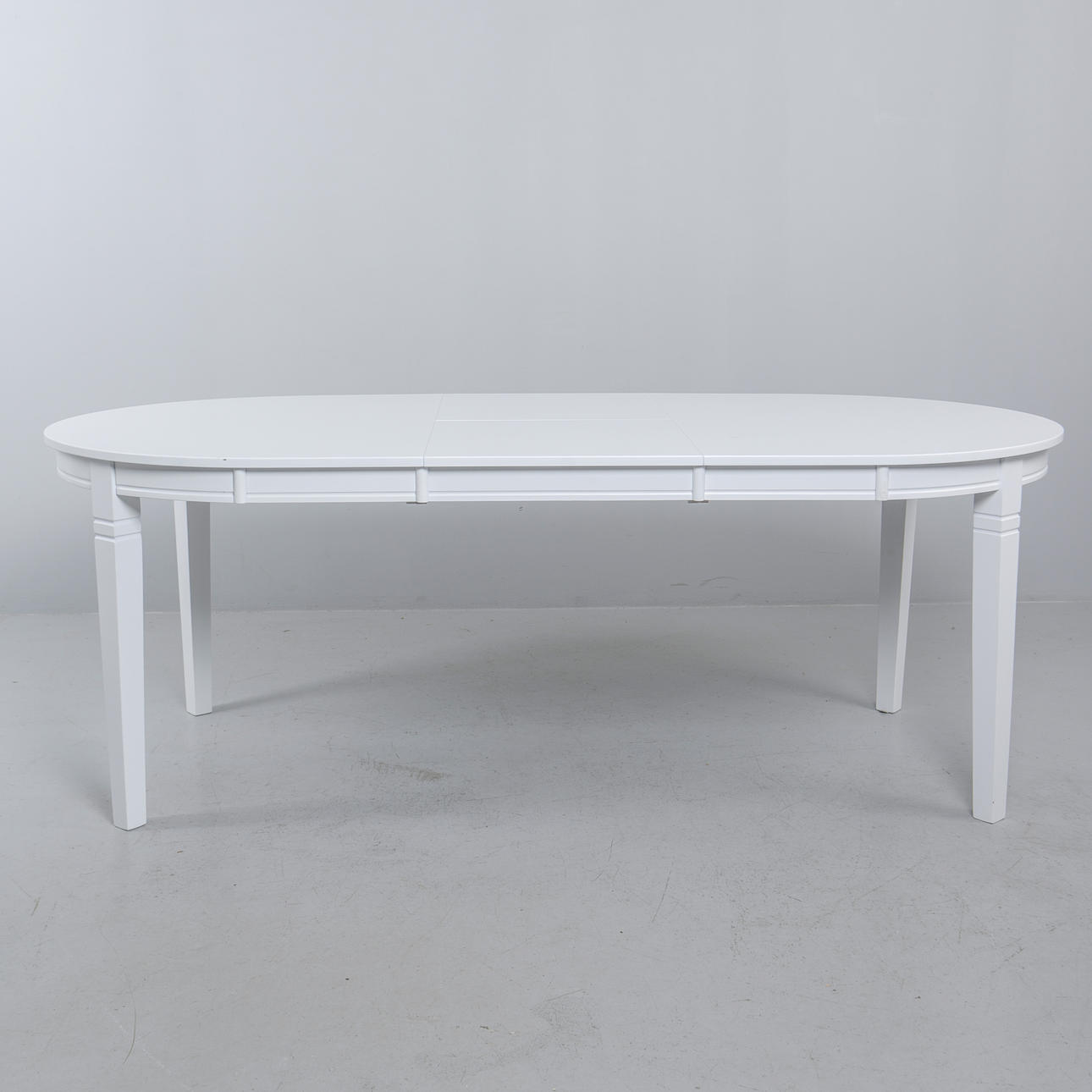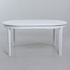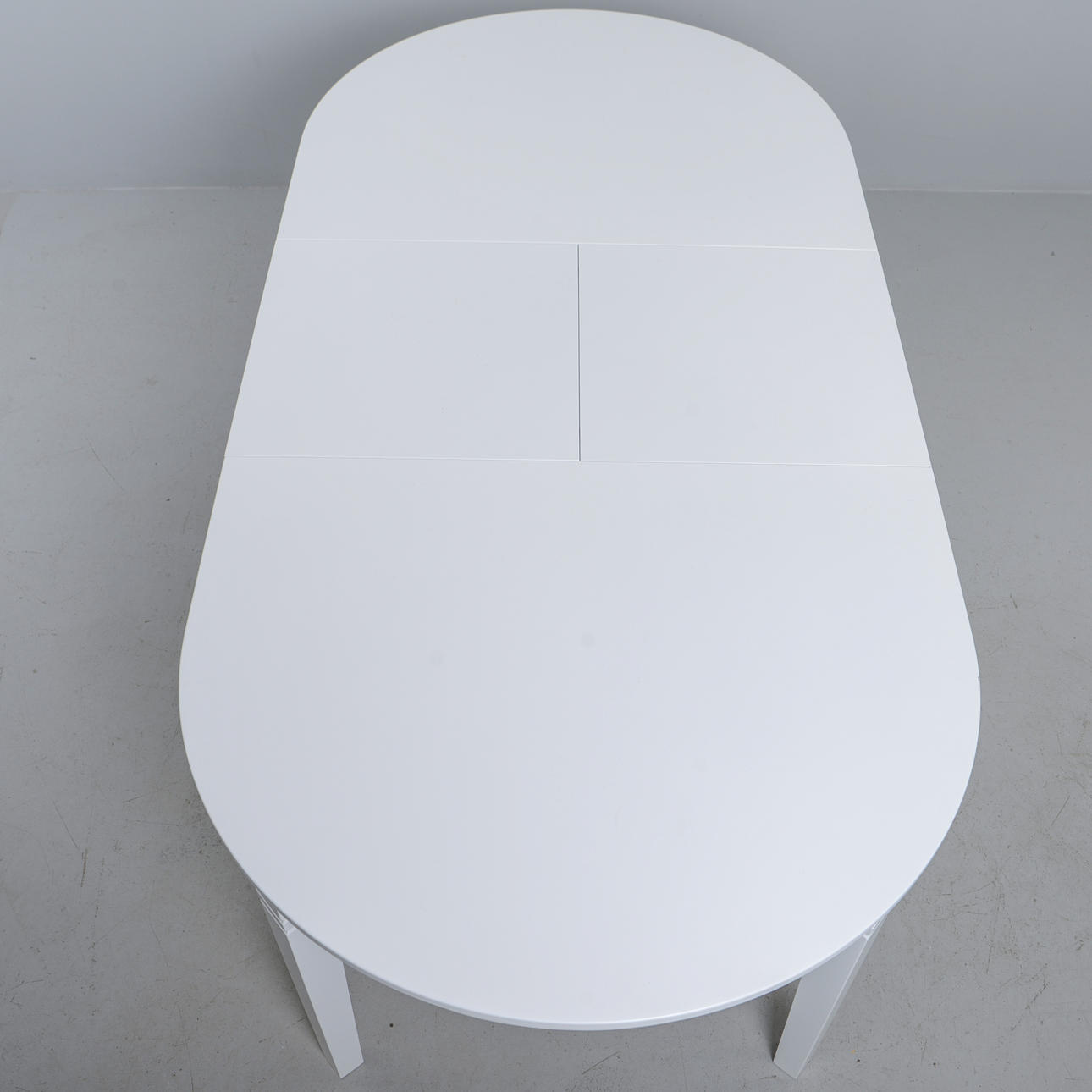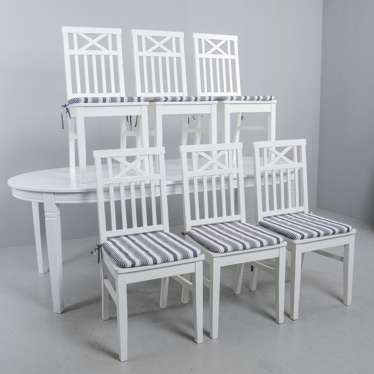 Bord modell "Alice" med 1 iläggsskiva. Stolar modell "Moa", 6 st. Bordets längd 160+50 cm, bredd 100 cm, höjd 75 cm. Stolarnas höjd 96 / 47 cm.