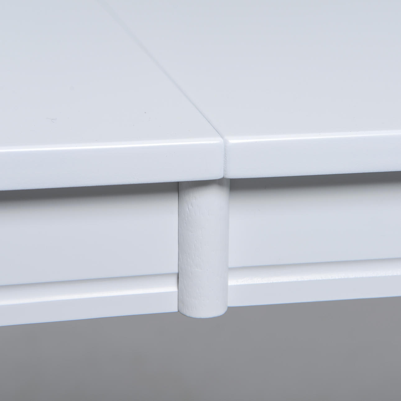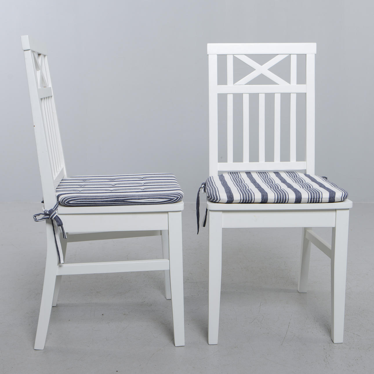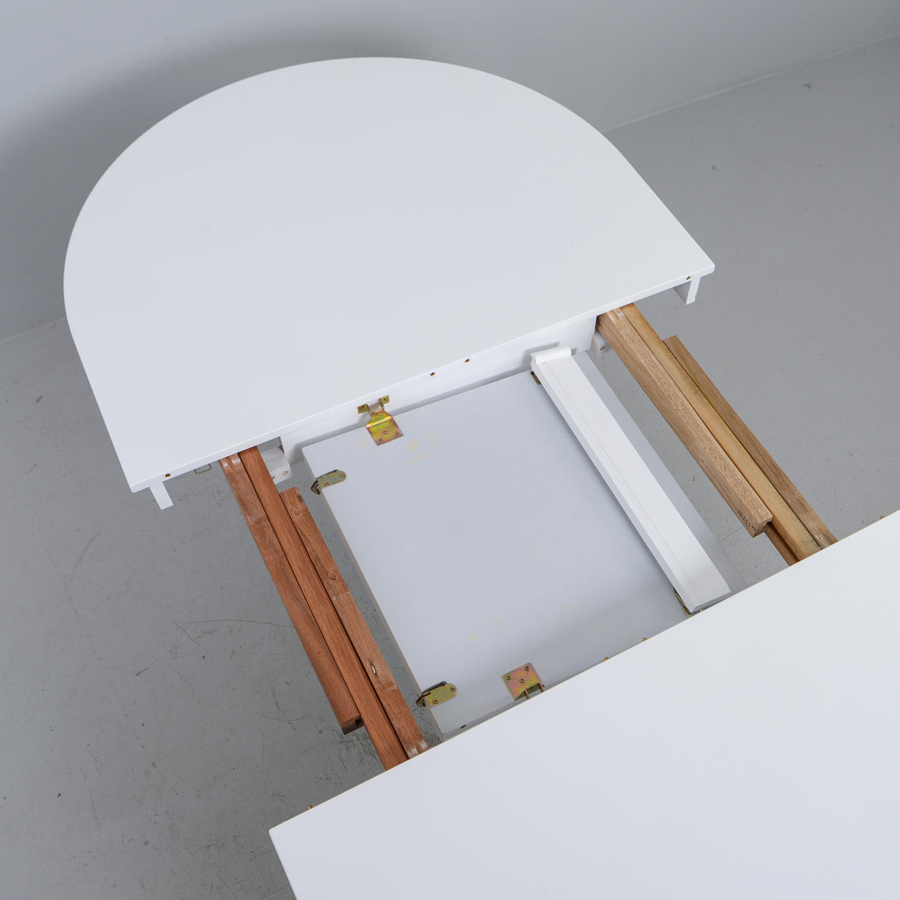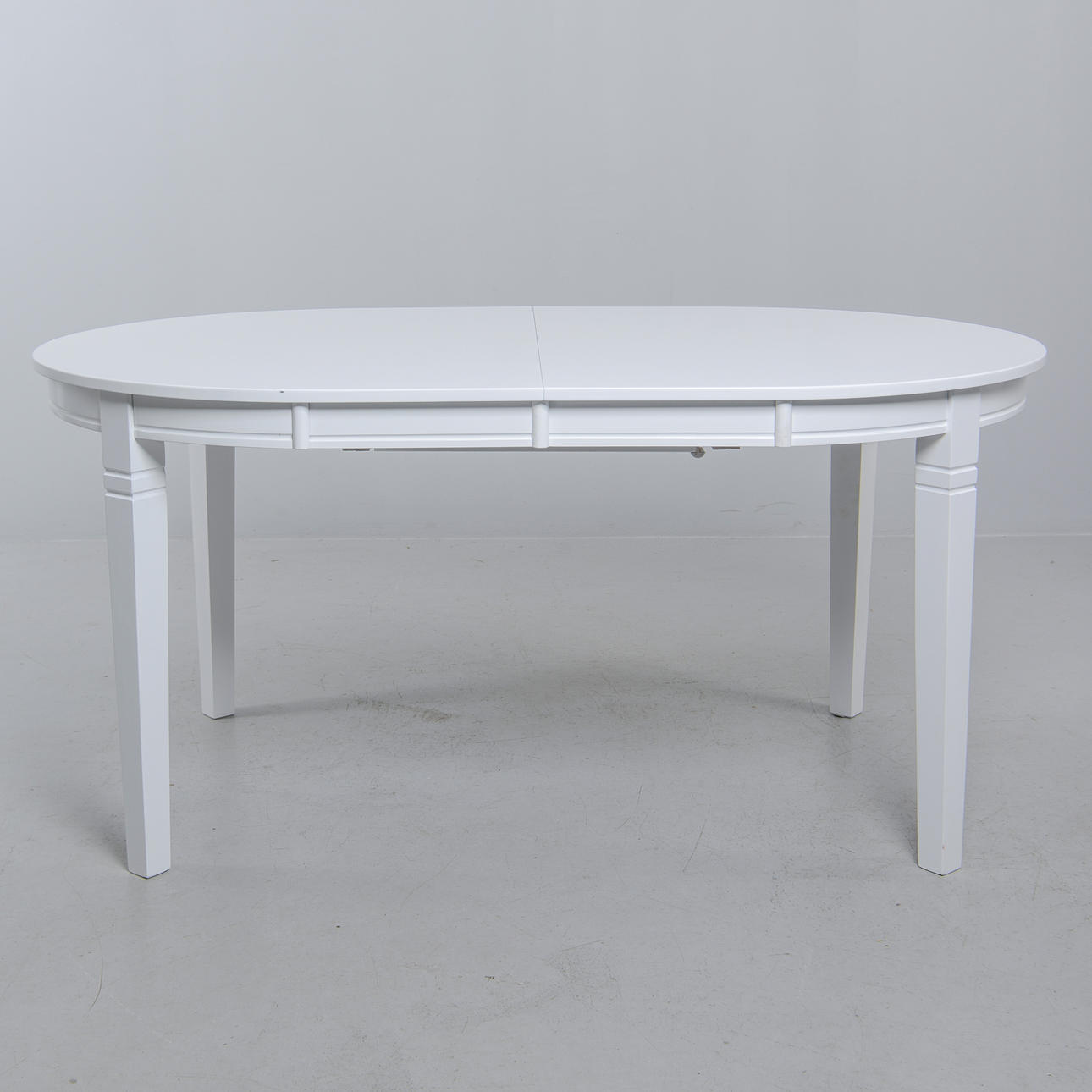 Bord modell "Alice" med 1 iläggsskiva. Stolar modell "Moa", 6 st. Bordets längd 160+50 cm, bredd 100 cm, höjd 75 cm. Stolarnas höjd 96 / 47 cm.