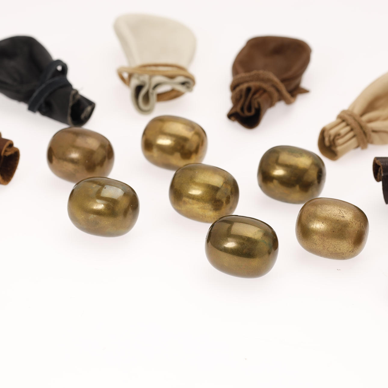 7 st. 'Super ägg' gjord av mässing. Designad av Piet Hein. Höjd 3,3 cm. Läderpåsar ingår.