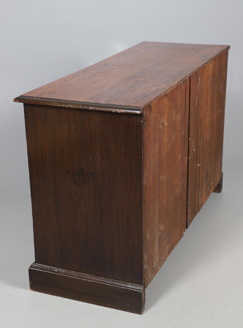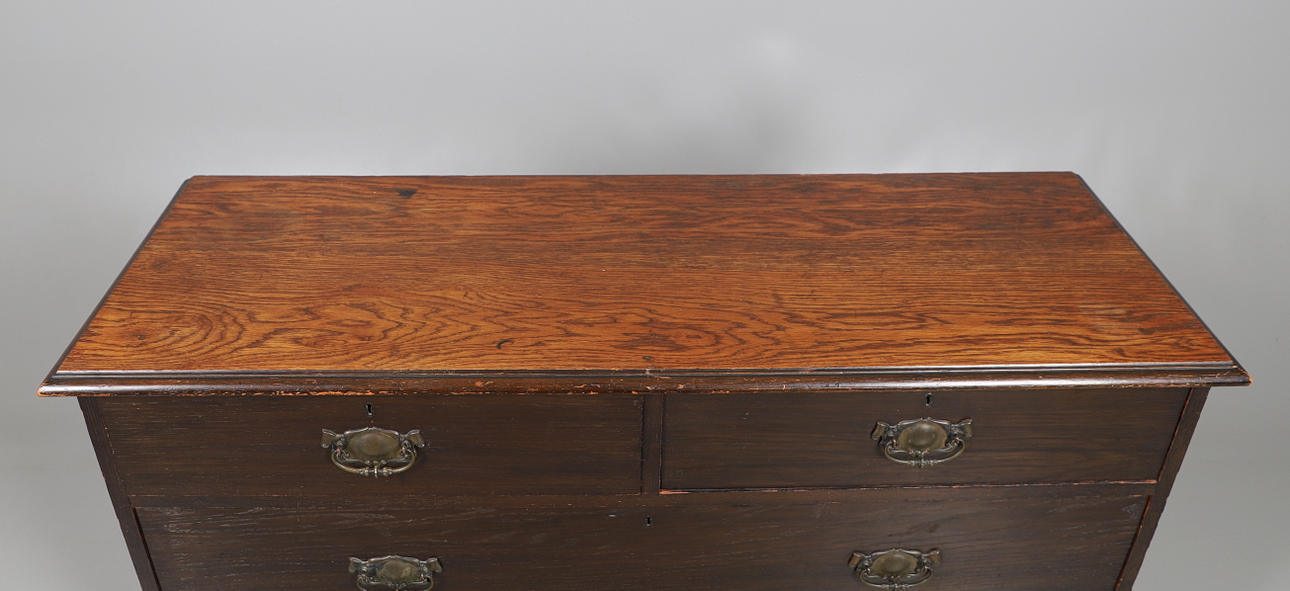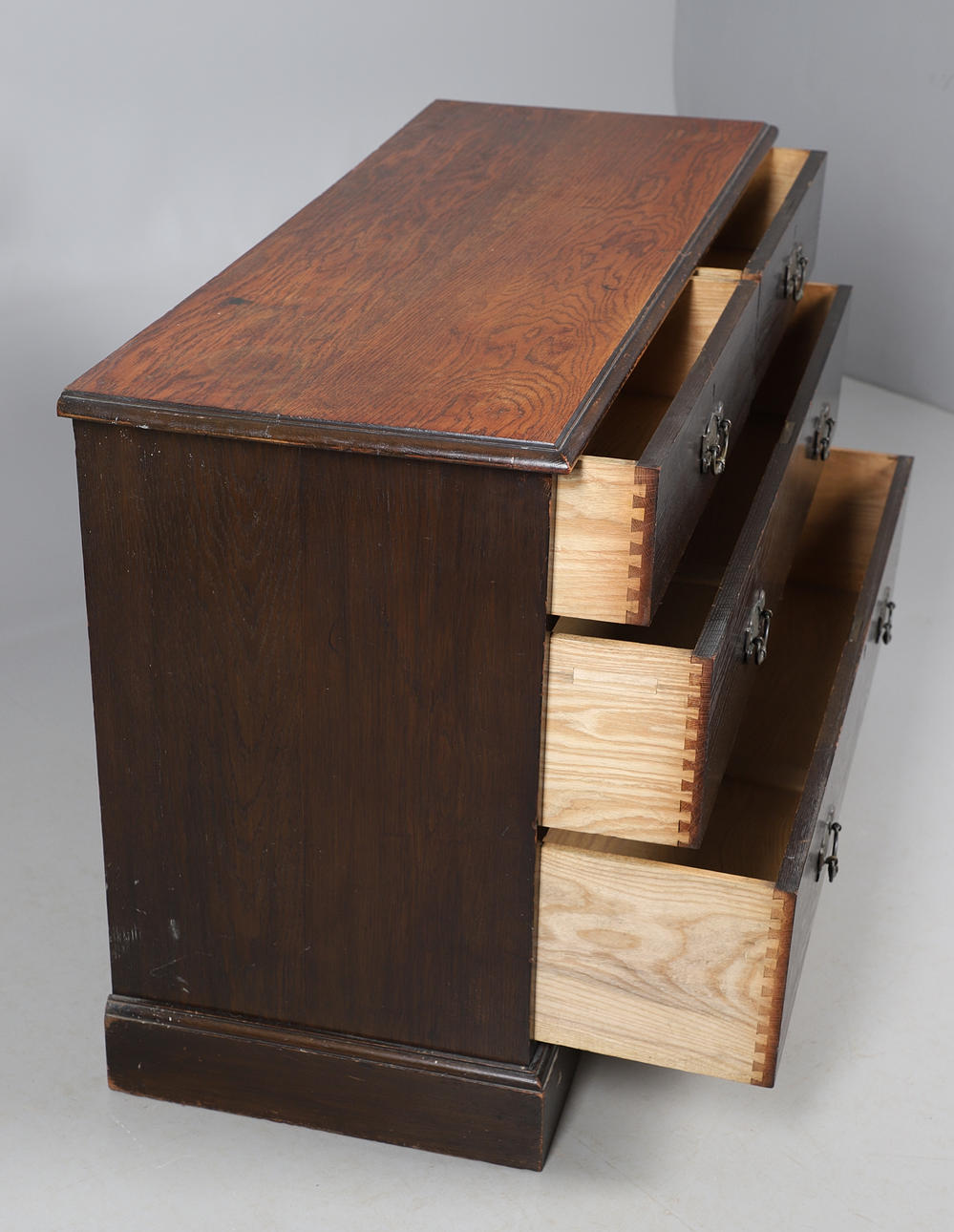 Möjligen en ombyggd bit (tidigare med en topp), med två korta lådor över två långa graderade lådor, alla med dekorativa metalldrag. Höjd 79cm x Bredd 127cm x Djup 47cm.
