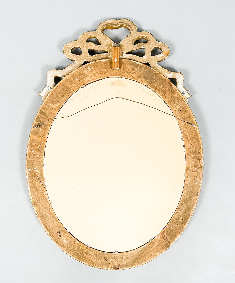 Oval form, förgylld. Rosett, pärlstav mm Höjd 77 cm, Bredd 54 cm.