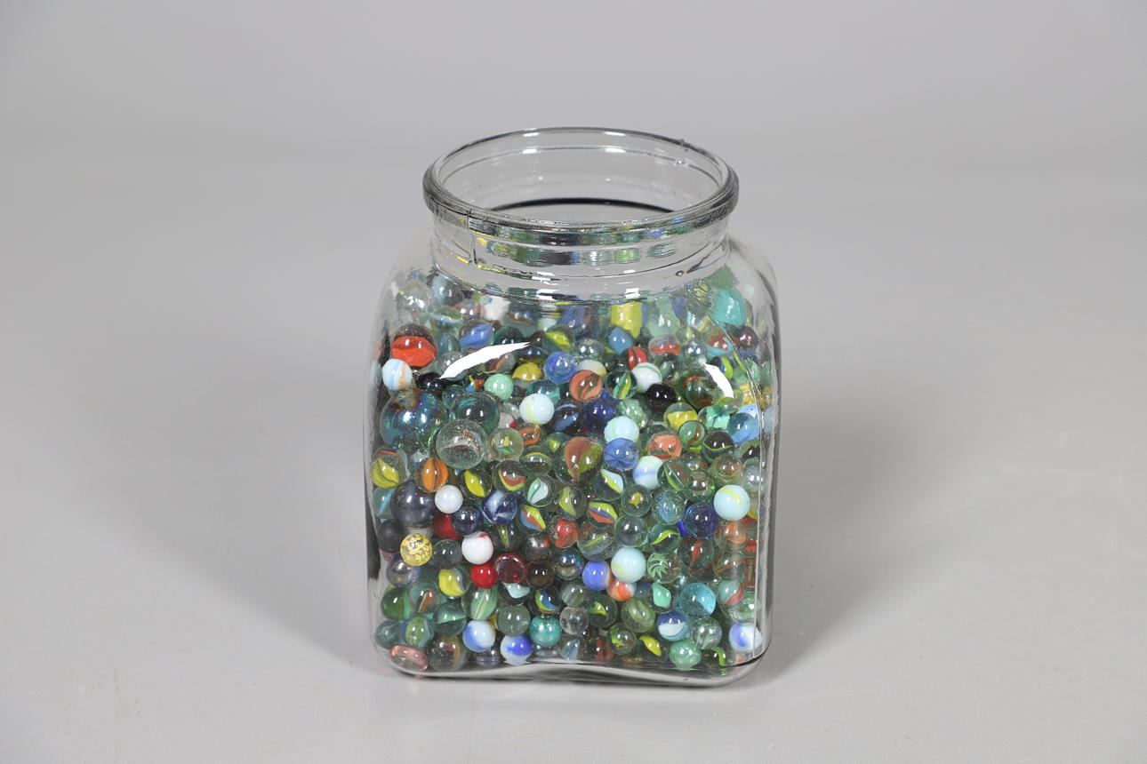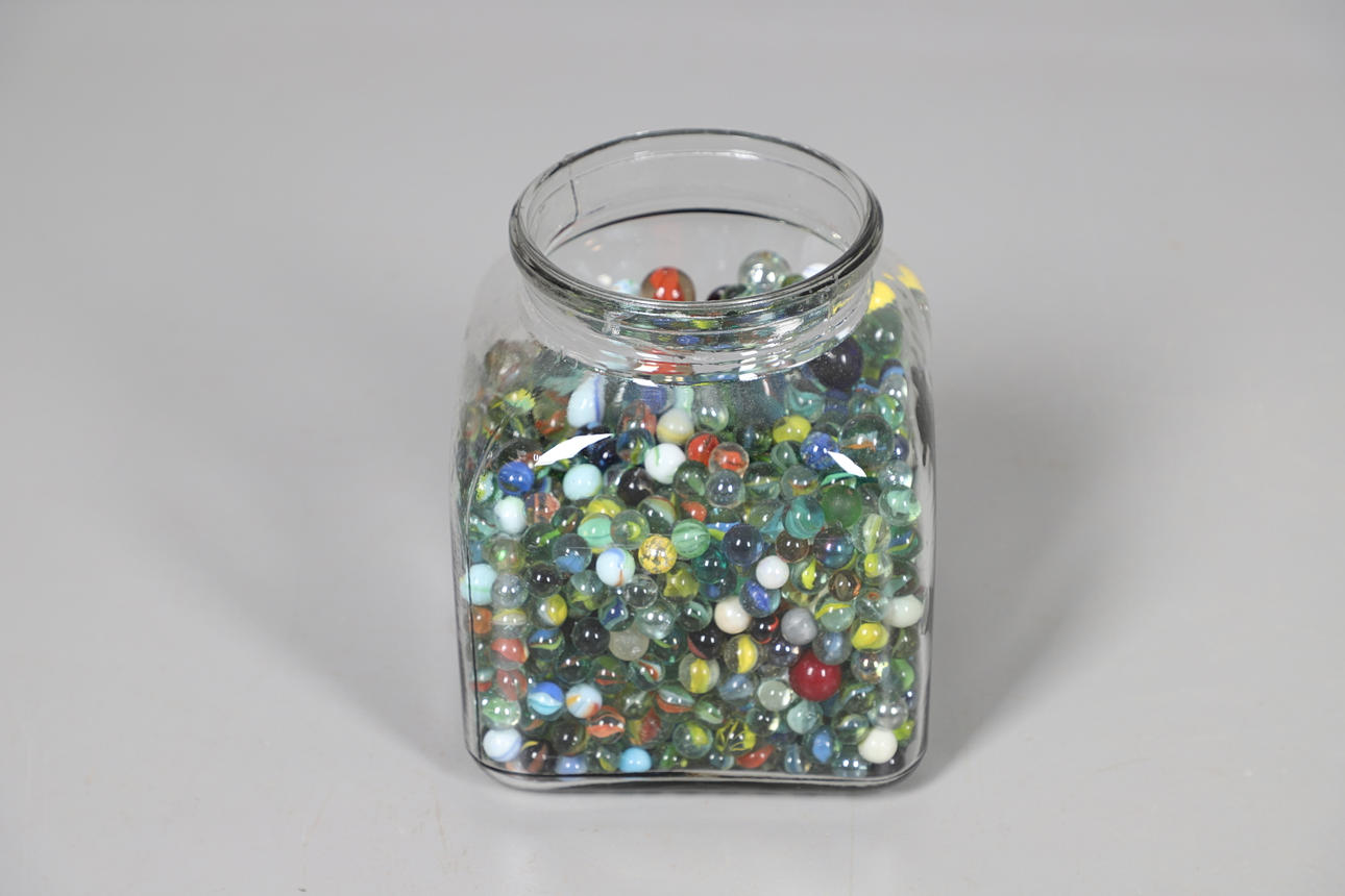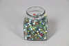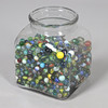 Små glaskulor i olika färg och design, ett blandat utbud av storlekar, hålls i en glasburk (Höjd 24cm x Bredd 20cm x Djup 20cm).