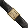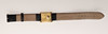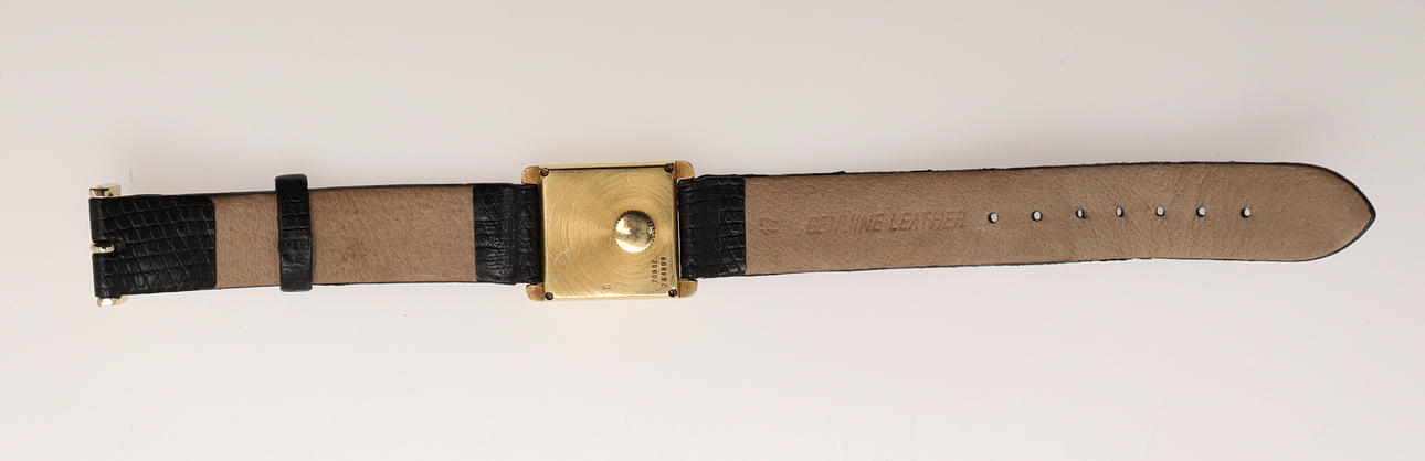 Piaget kvarts guldklocka med romerska siffror på fyrkantig ram och läderrem, serienummer på baksidan 70802 och 284899.