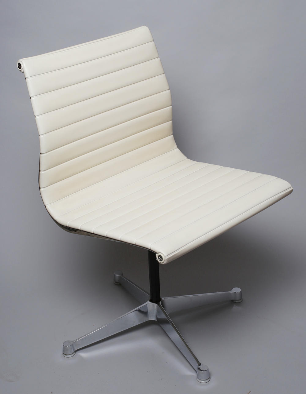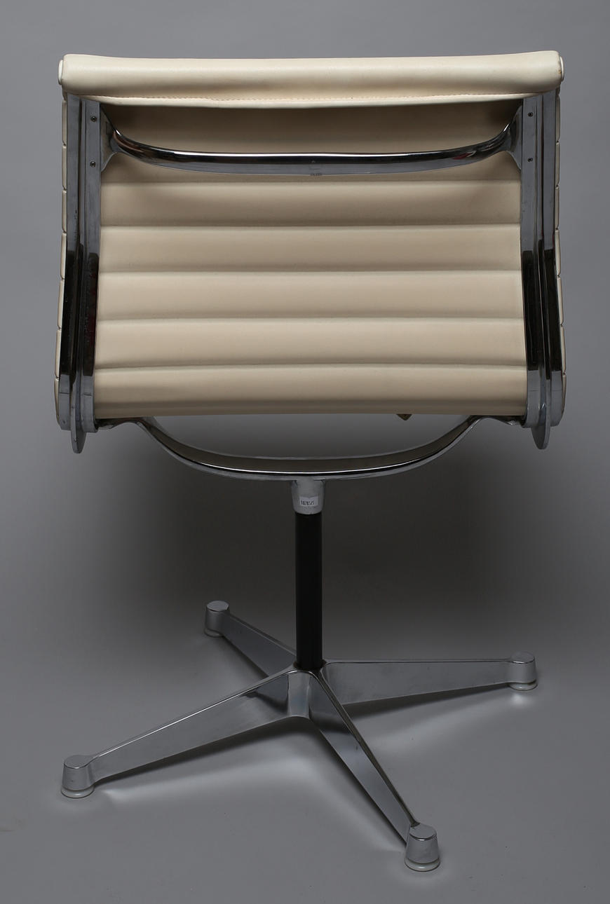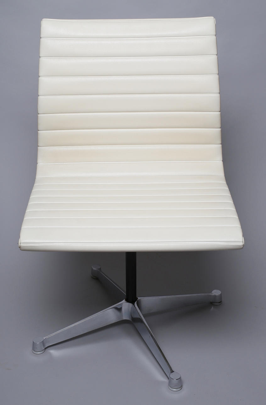 Fyrbalk, förkromad aluminiumbas med vita glidbanor, roterande sits med vitt läder, efter design från 1958. Herman Miller design (botten med etikett och inskriven i gjutna). 1900-talets höjd 83 cm.