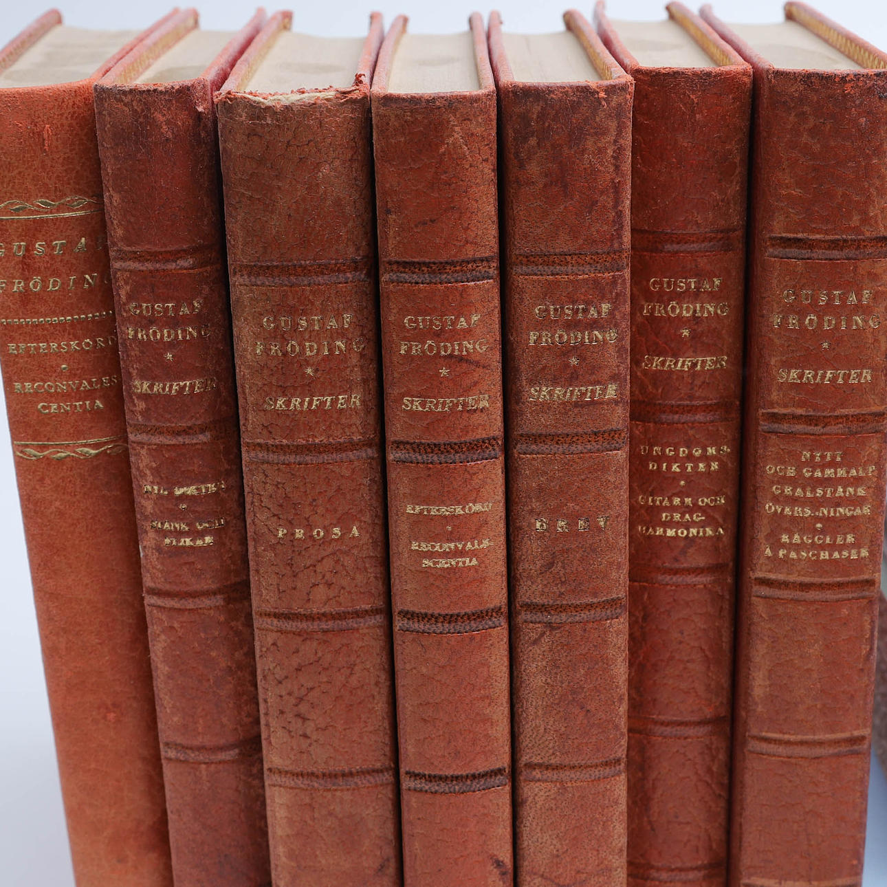 10 böcker av Fröding, bl.a. Samlade skrifter, Den svenska lyriken, Efterskörd, Stänk och flikar, Prosa, Brev, Ungdomsdikter, Nytt och gammalt.