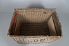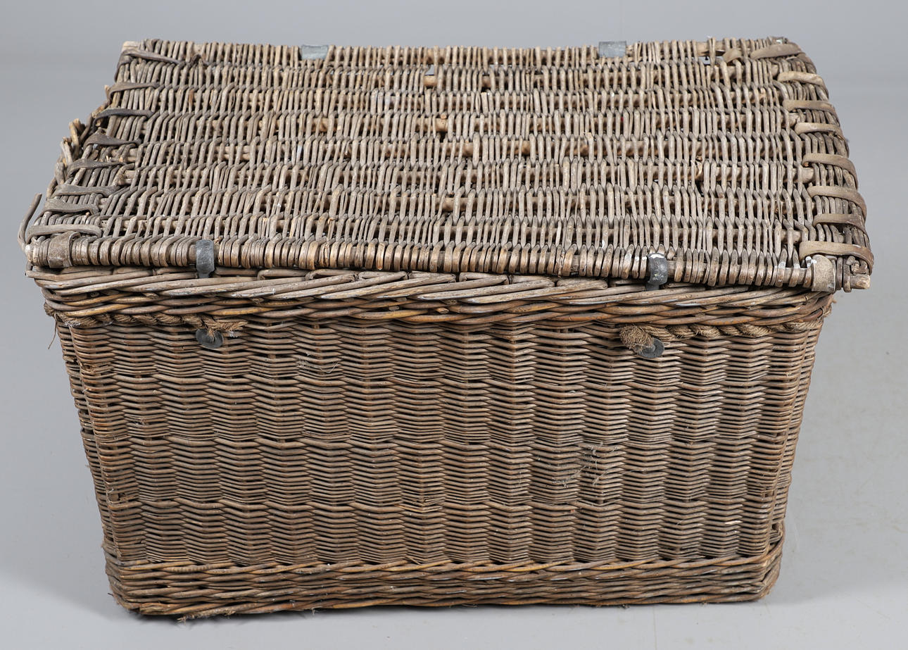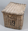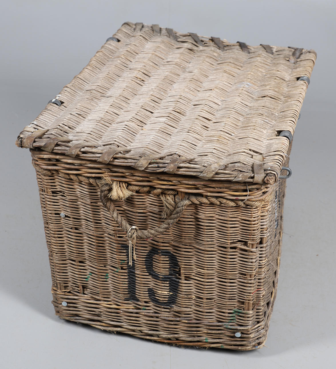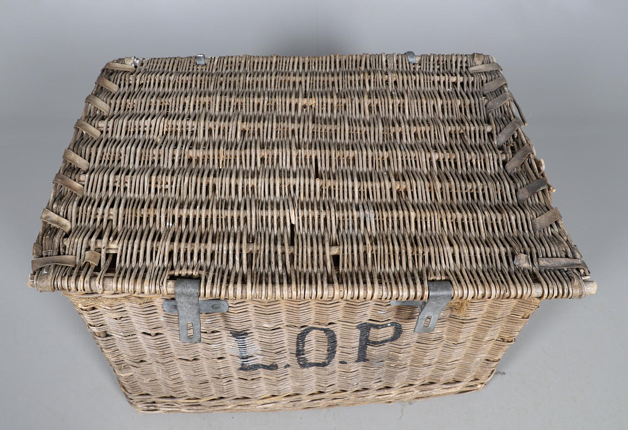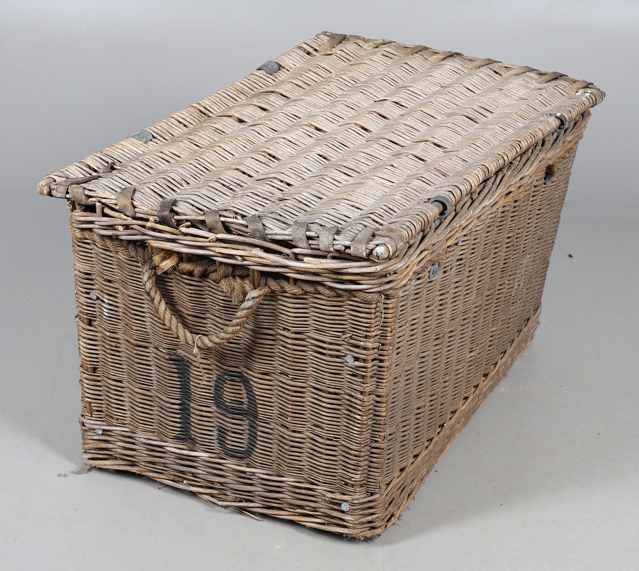 rektangulär med lyfttopp, rephandtag, metallhaspar och stencilerade bokstäver 93 cm x 63 cm x 58 cm.