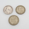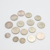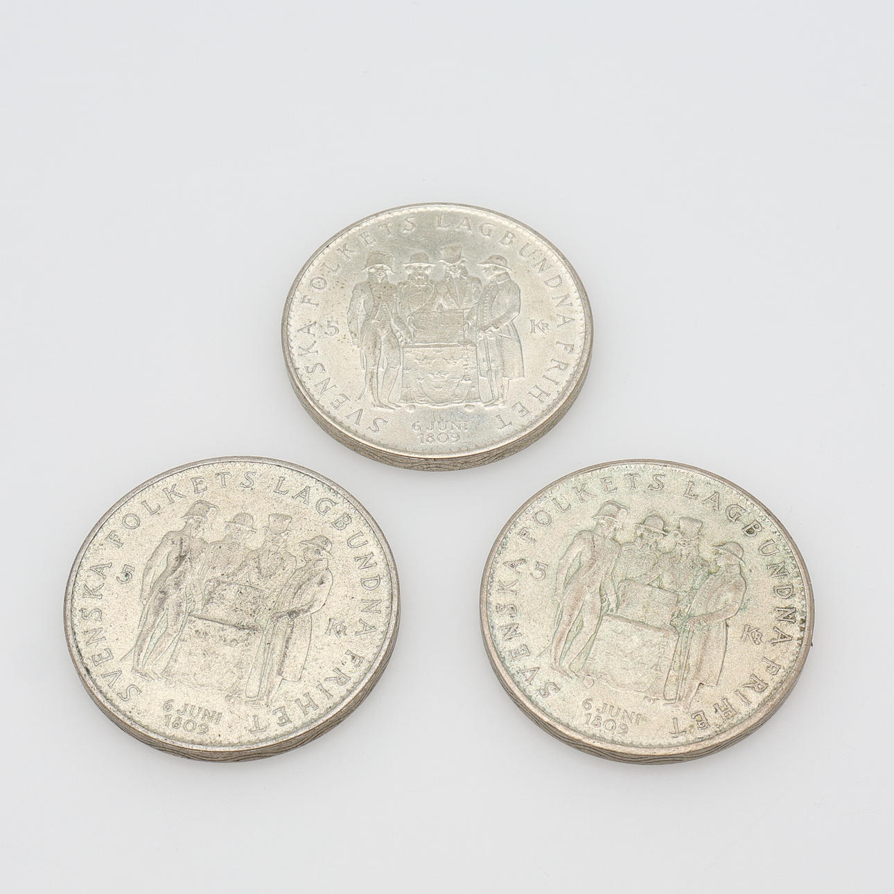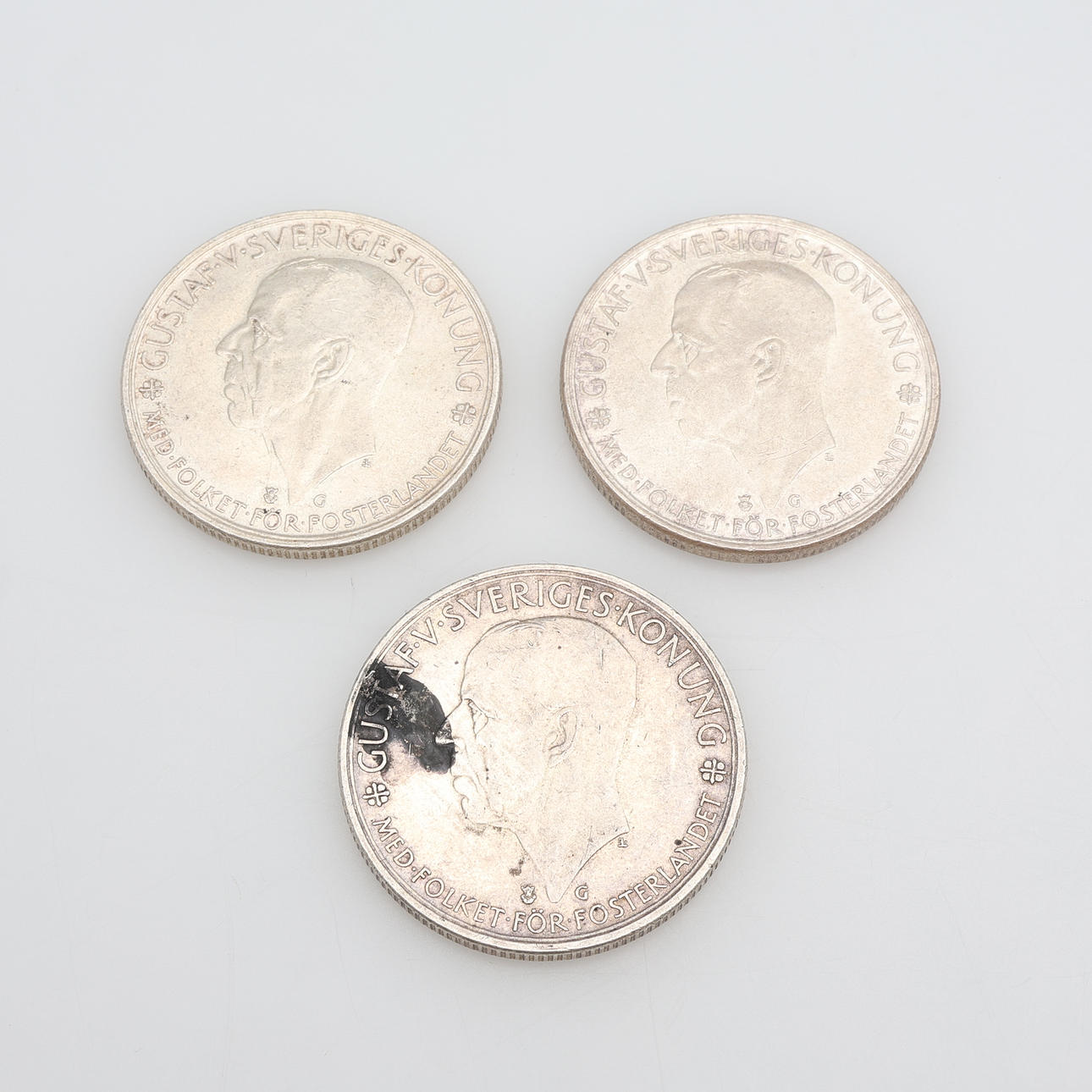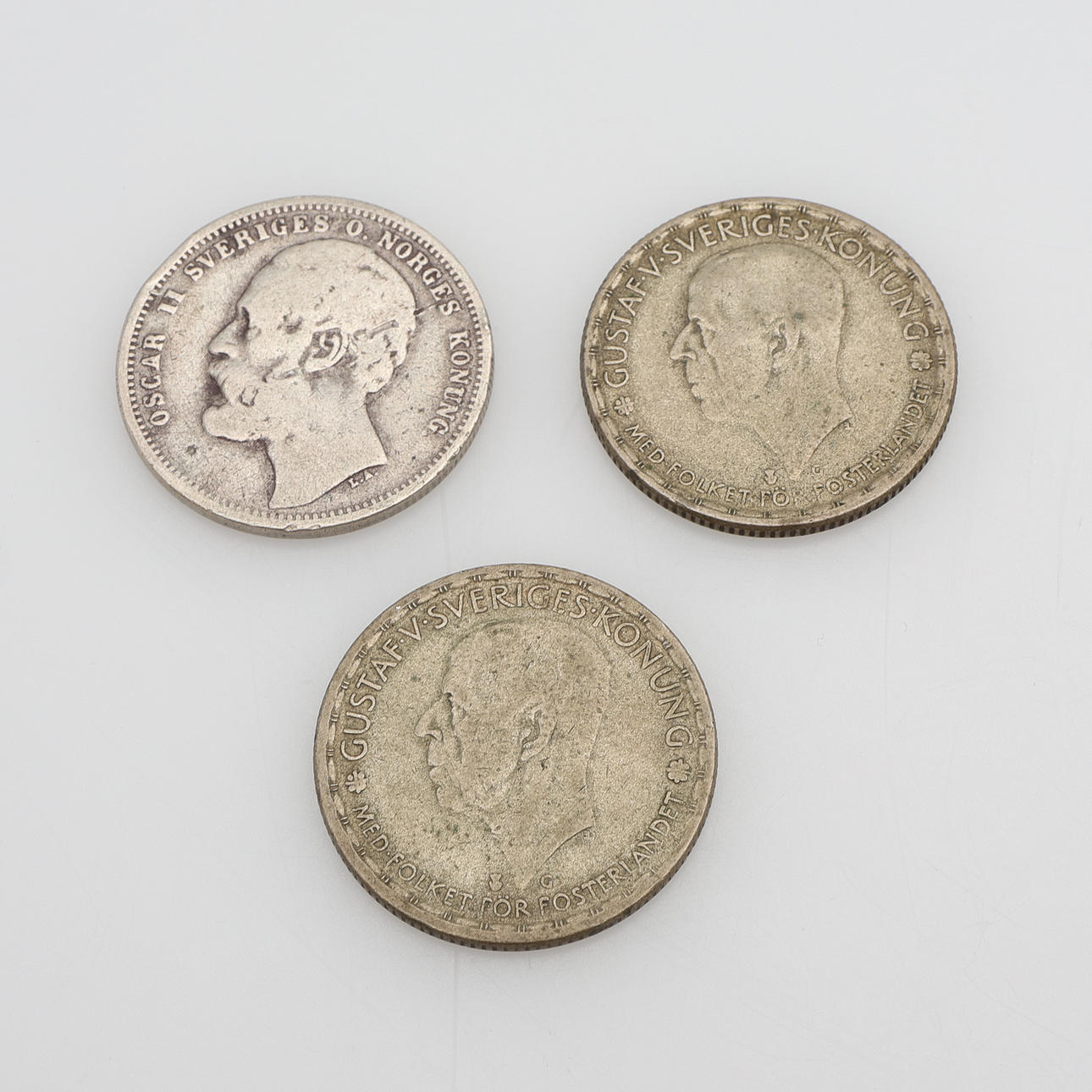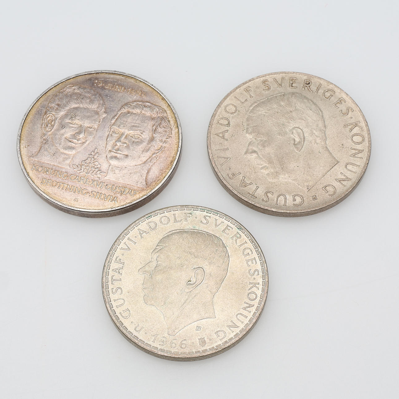 Mynt, 50 kr, med sterling silver, 26,8 gram. Mynt med 40% silverhalt, 164,6 gram. Mynt med 80% silverhalt, 82 gram.