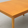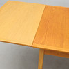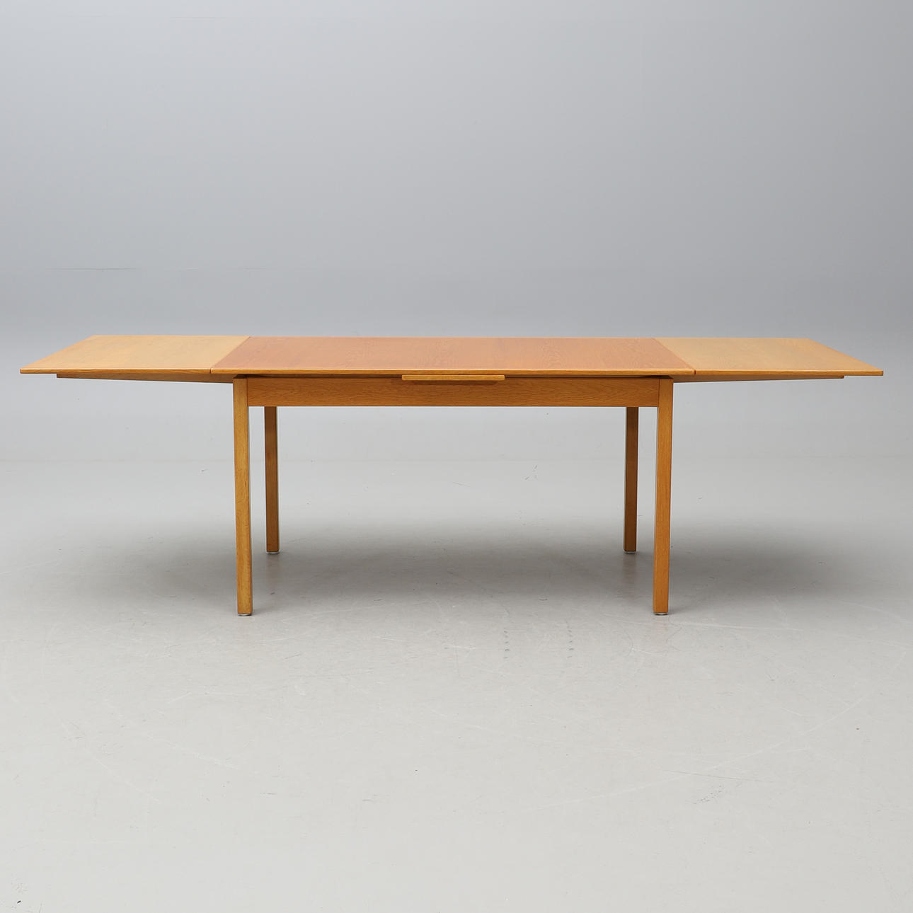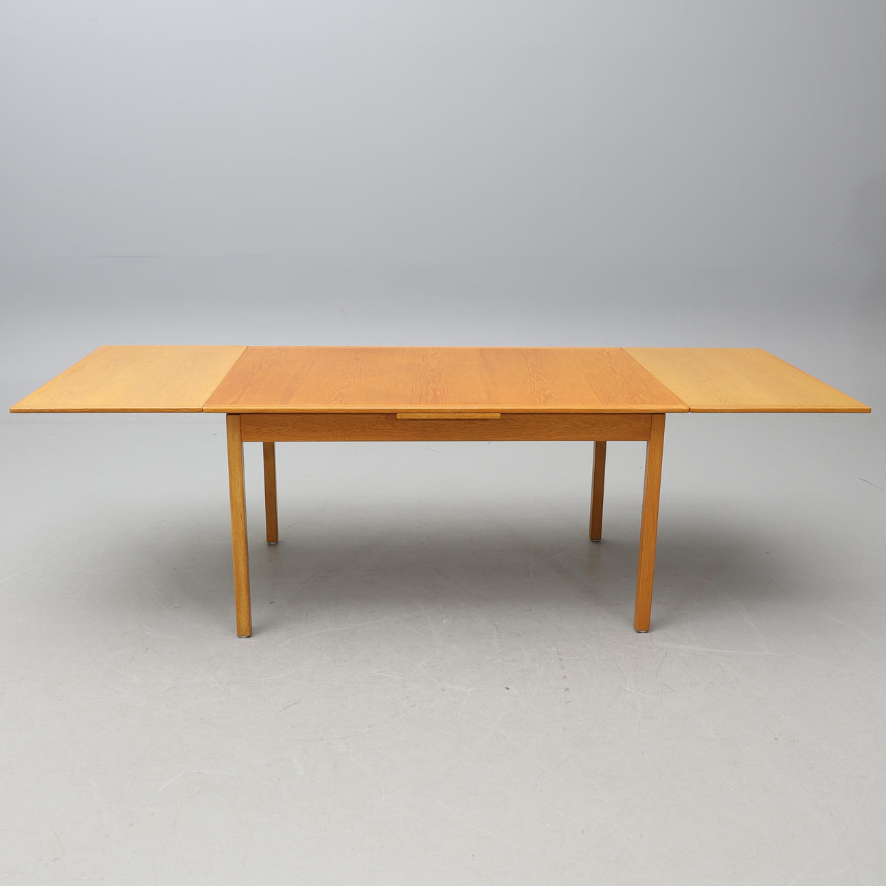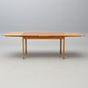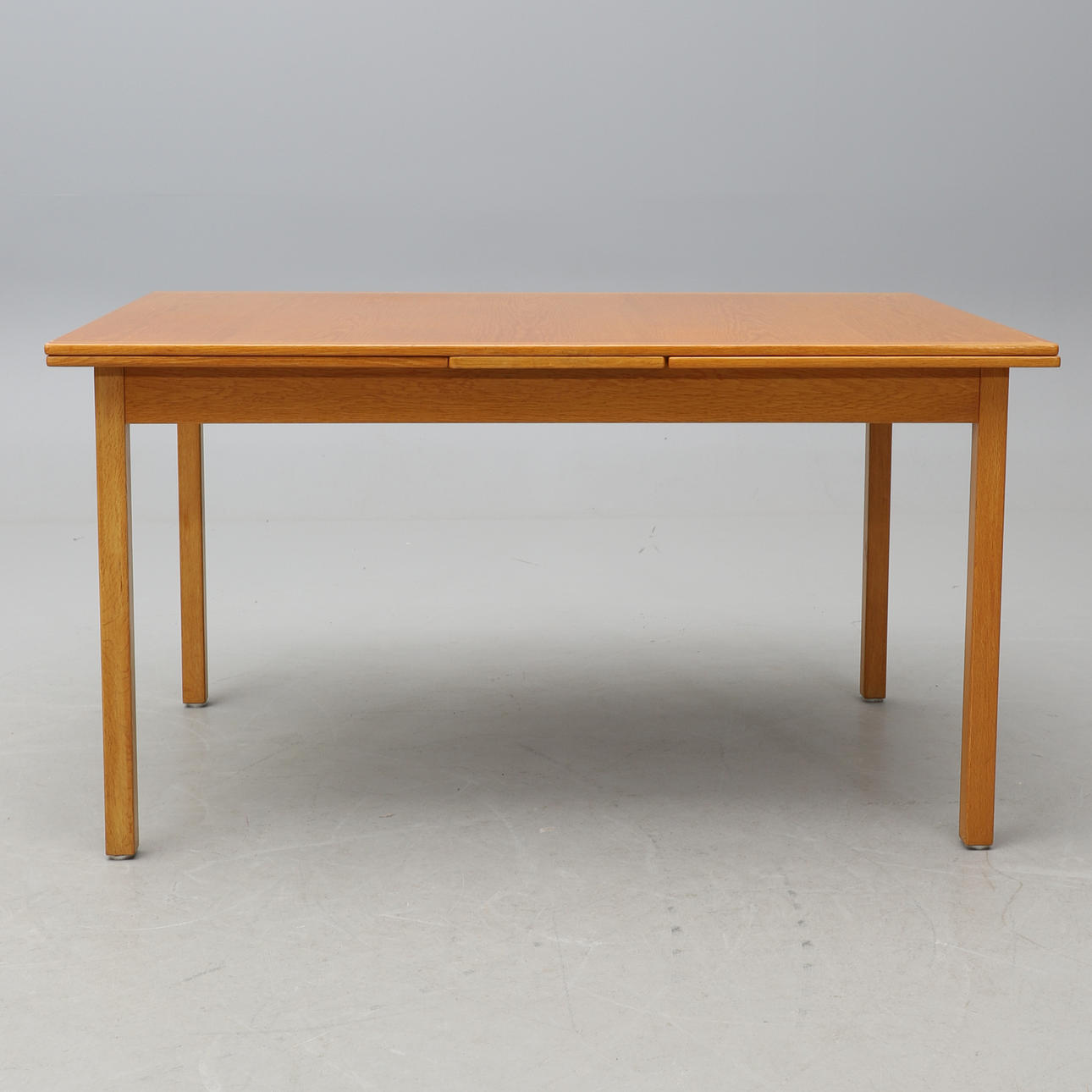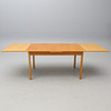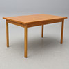 Ek. Rektangulär skiva, två utdragbara iläggsskivor à 55 cm. Längd 140, bredd 90, höjd 74 cm.