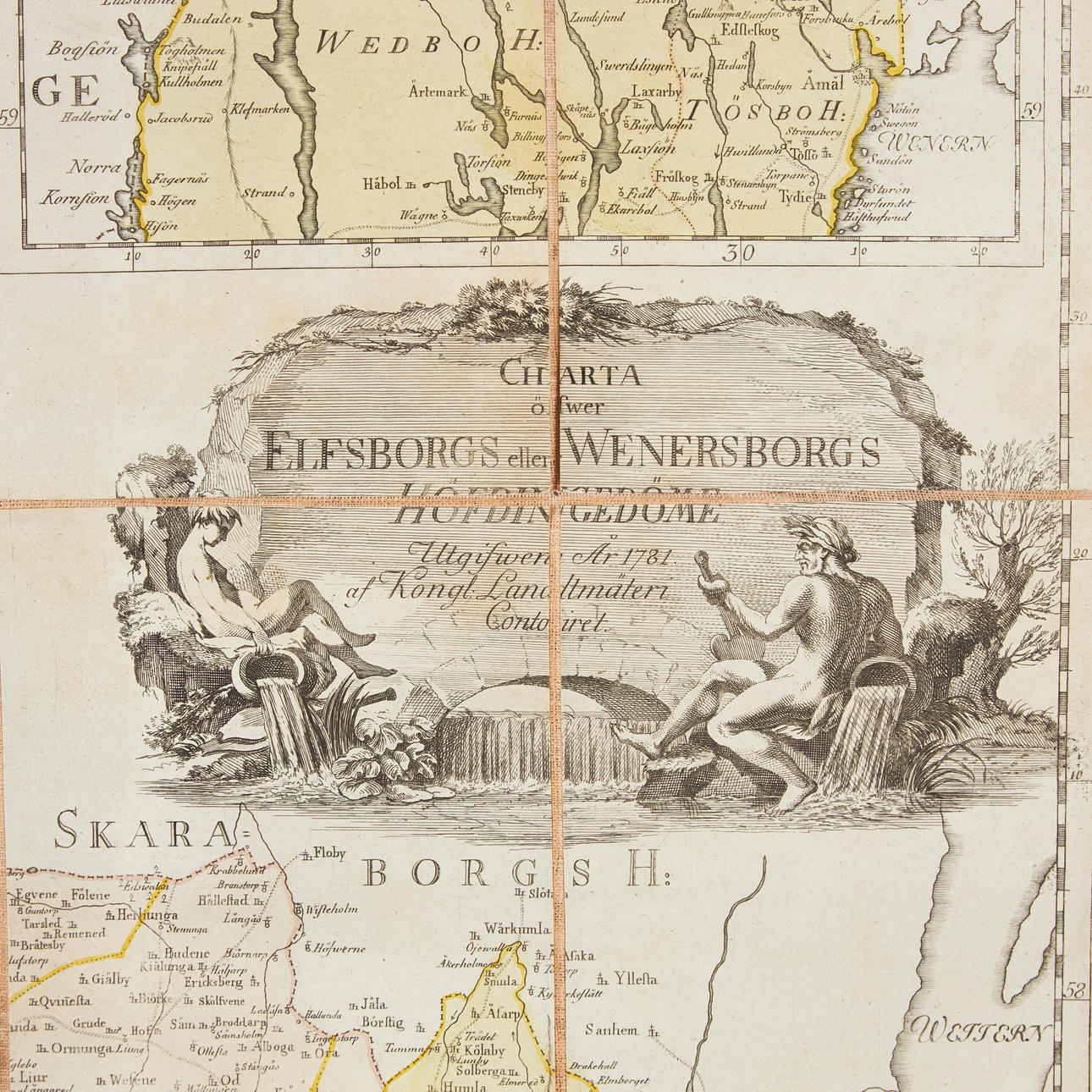 Charta öfwer Elfsborgs eller Wenersborgs höfdingedöme, Utg. Kongl. Landtmäteri Contoiret 1781, delvis kolorerad graverad karta med infälld karta, stor figurativ kartusch i svart och vitt, graverad av C. Bergqvist, ca 580 x 500 mm, upplimmad på väv och skuren. Vikt.