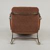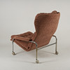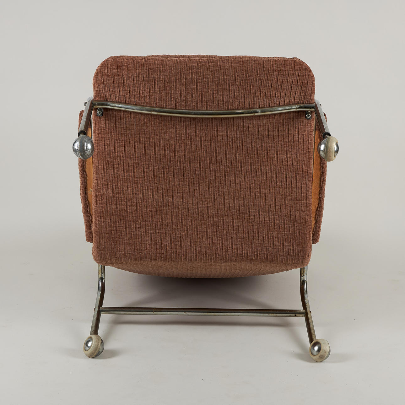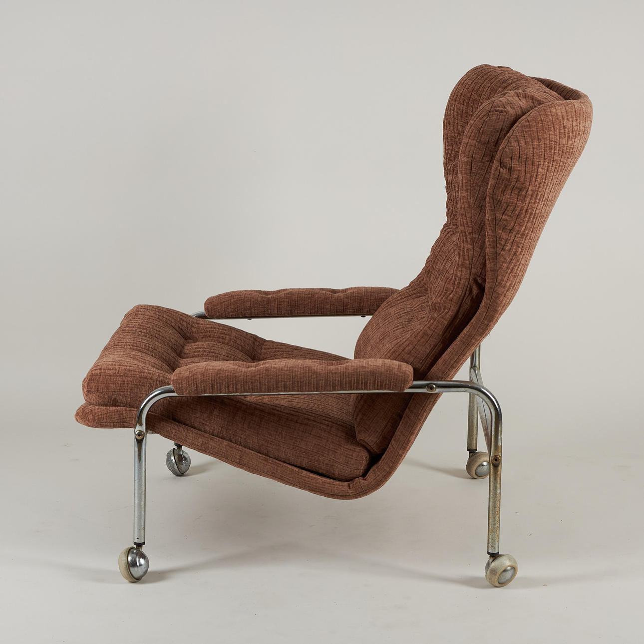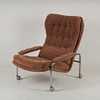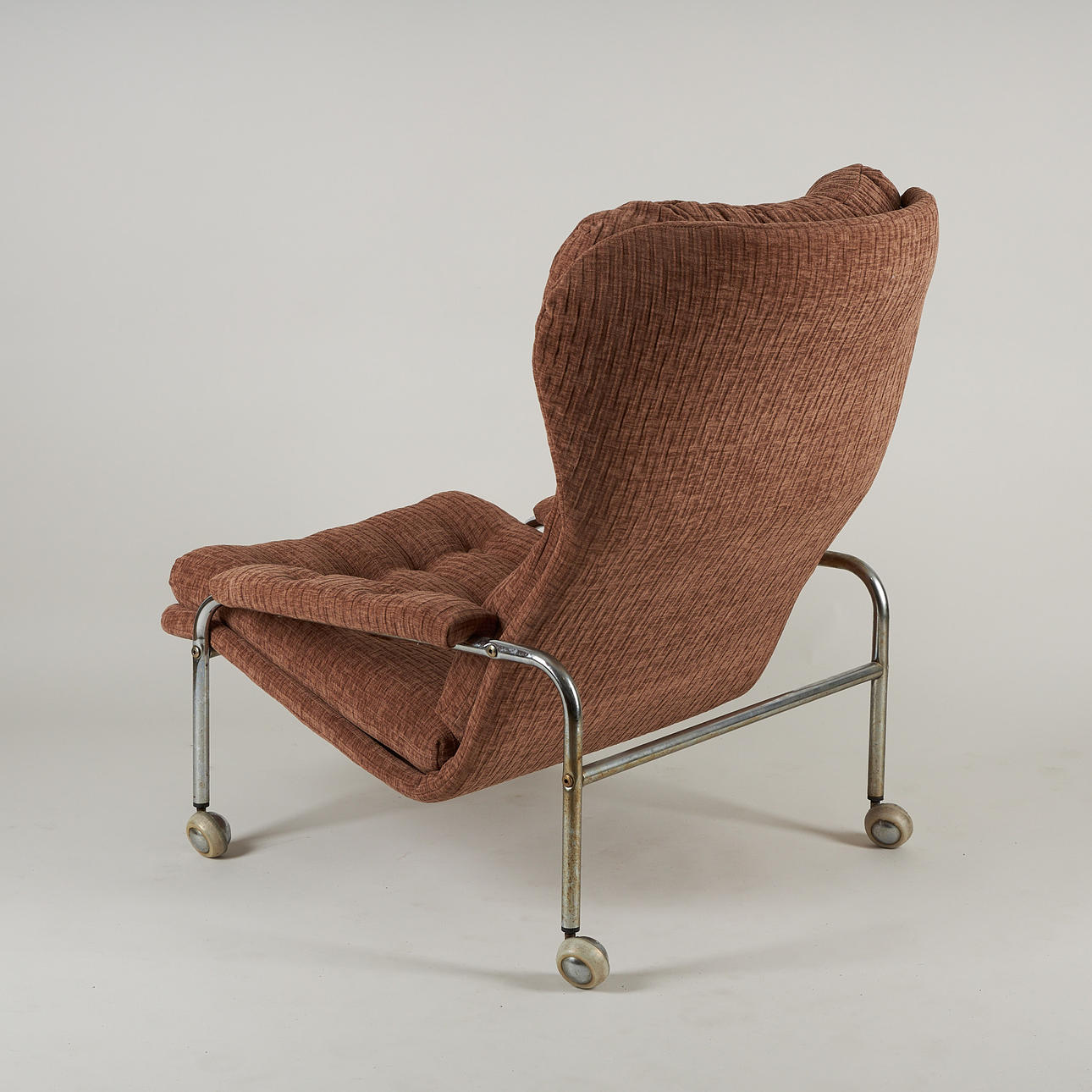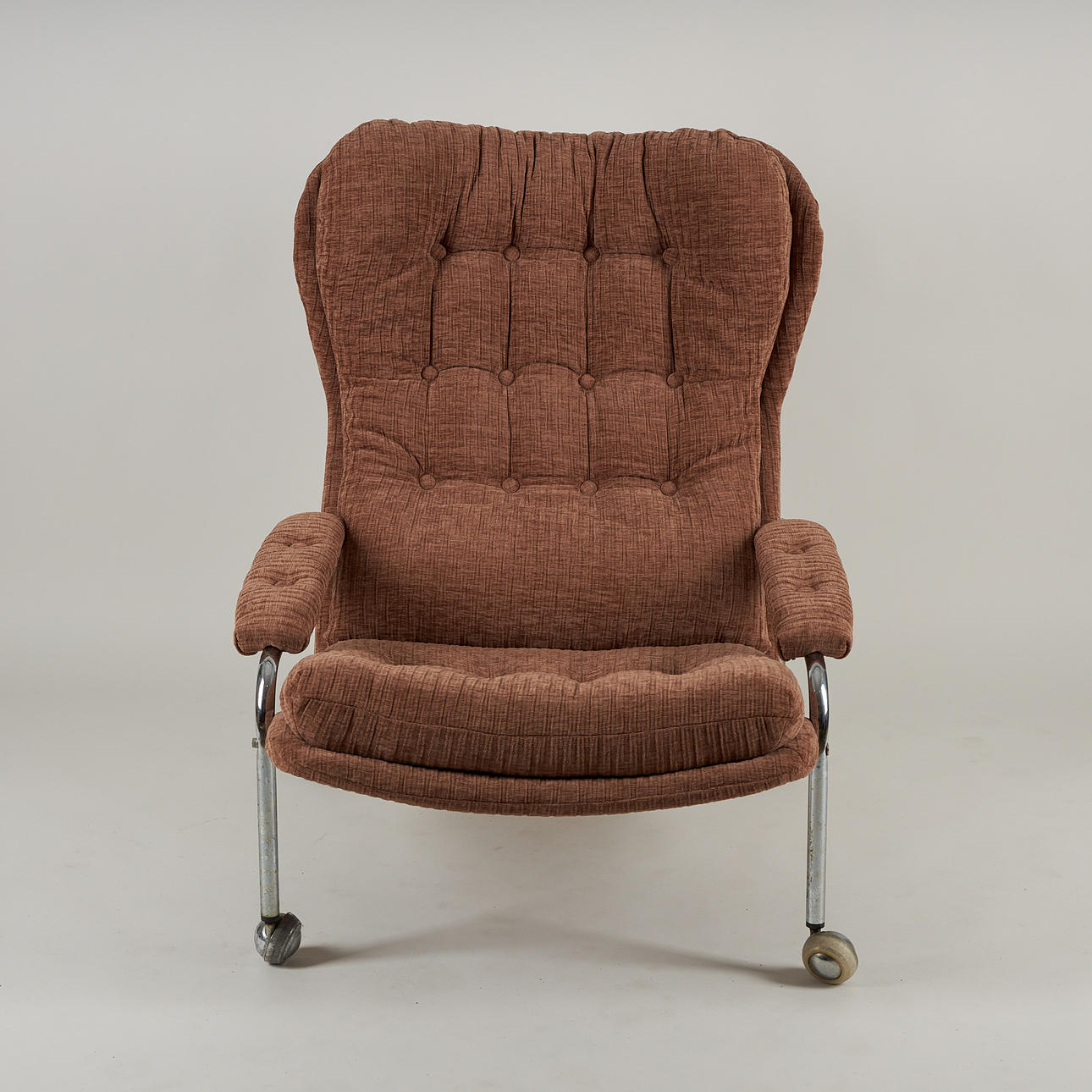 Stomme av kromad metall, fast stoppad klädsel. Höjd 88 cm, bredd 72 cm, sitthöjd ca 36 cm.