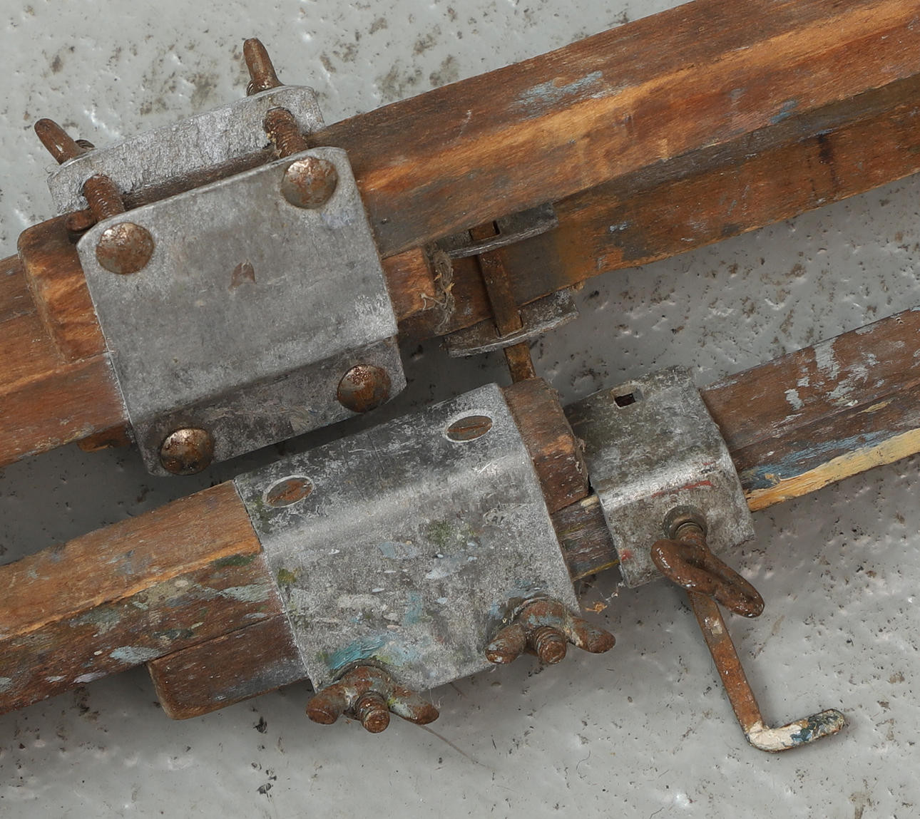 Slitage, målarfärg, rostiga skruvar/beslag. Ostadigt.
