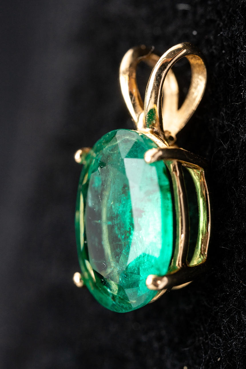 Hänge av 585 guld, infattad med en smaragd mitt i ca. 2,20 ct, smaragdmått ca. 10,8 mm x 8 mm, hänglängd ca. 1,6 cm Vikt ca. 1,1 gram.