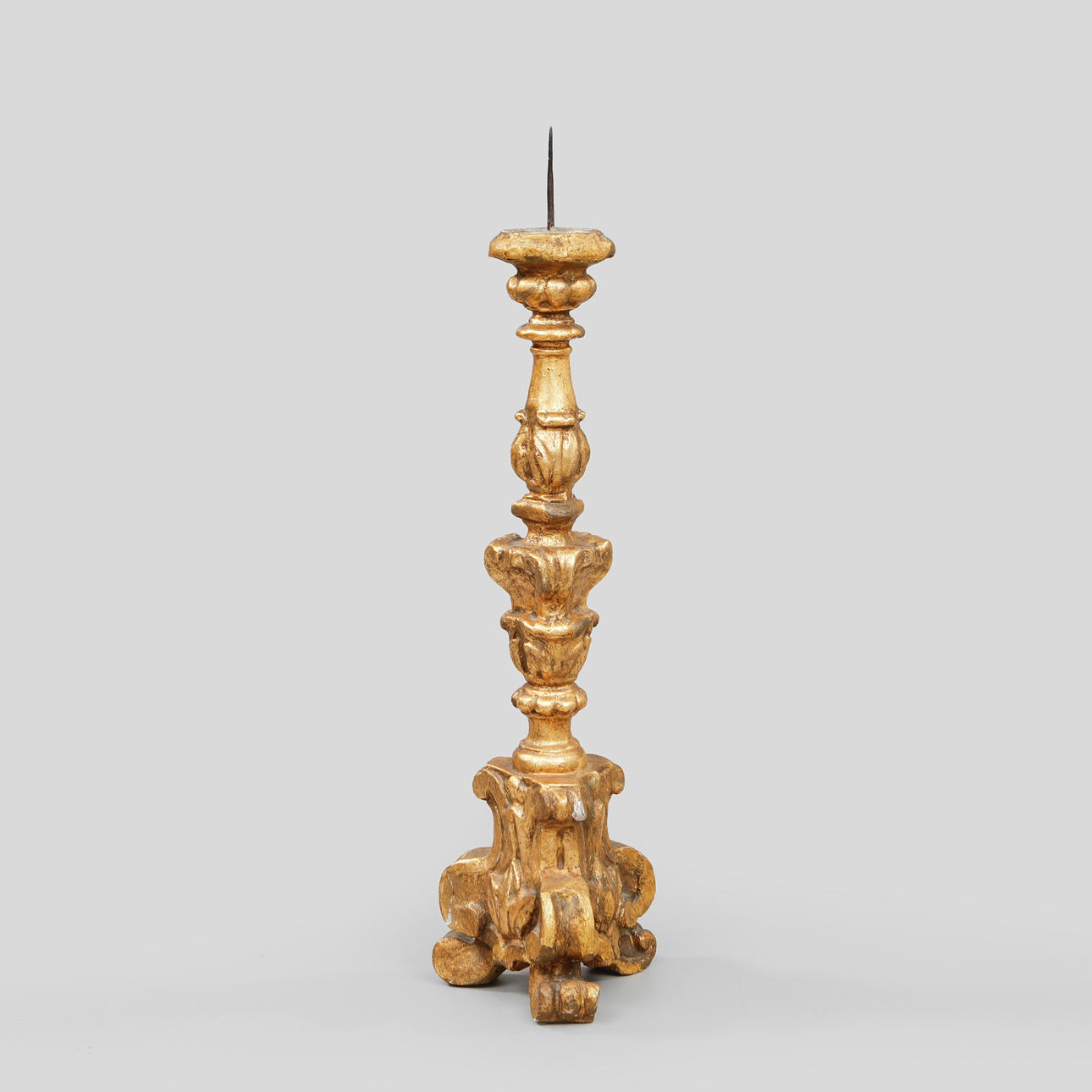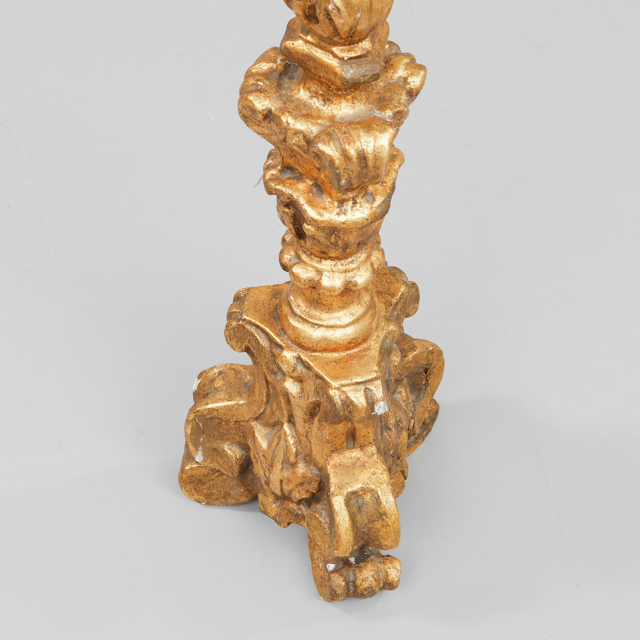 Skuret och förgyllt trä, höjd exklusive ljuspigg ca 76 cm.