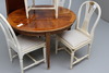 Gustaviansk stil . Bord i mahogny 109 cm i diameter + 3 skivor á 40 cm. 4 vita stolar, axetmodell.