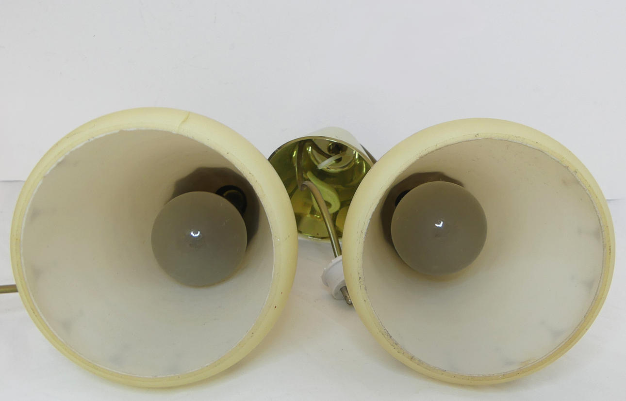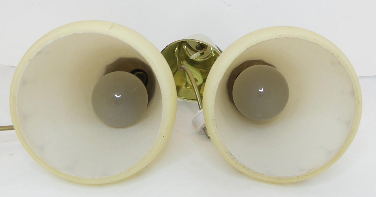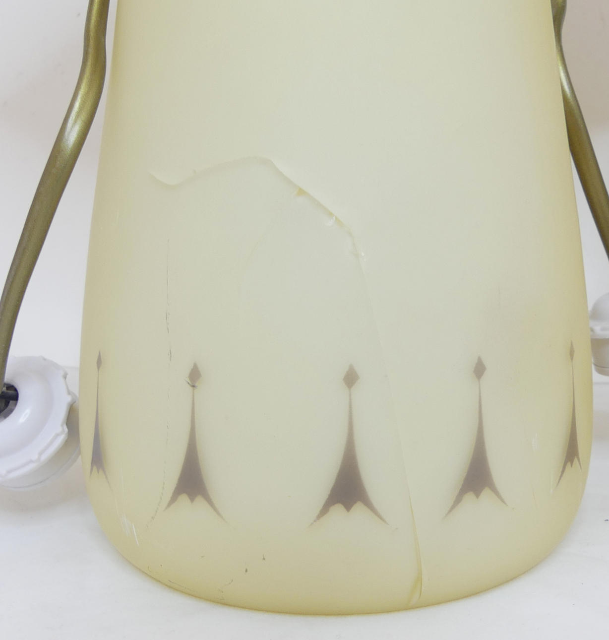Glas och metall. Storlek: höjd från tak 55 cm. Lampglas: höjd 32 cm, diameter längst ner ca 11,5 cm.