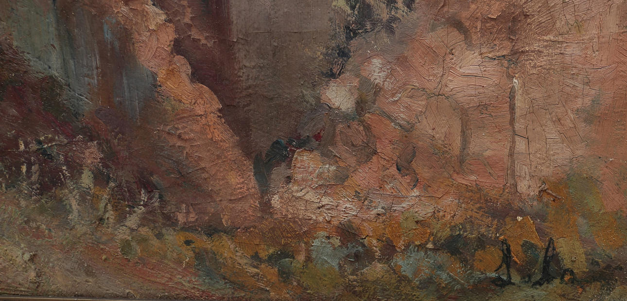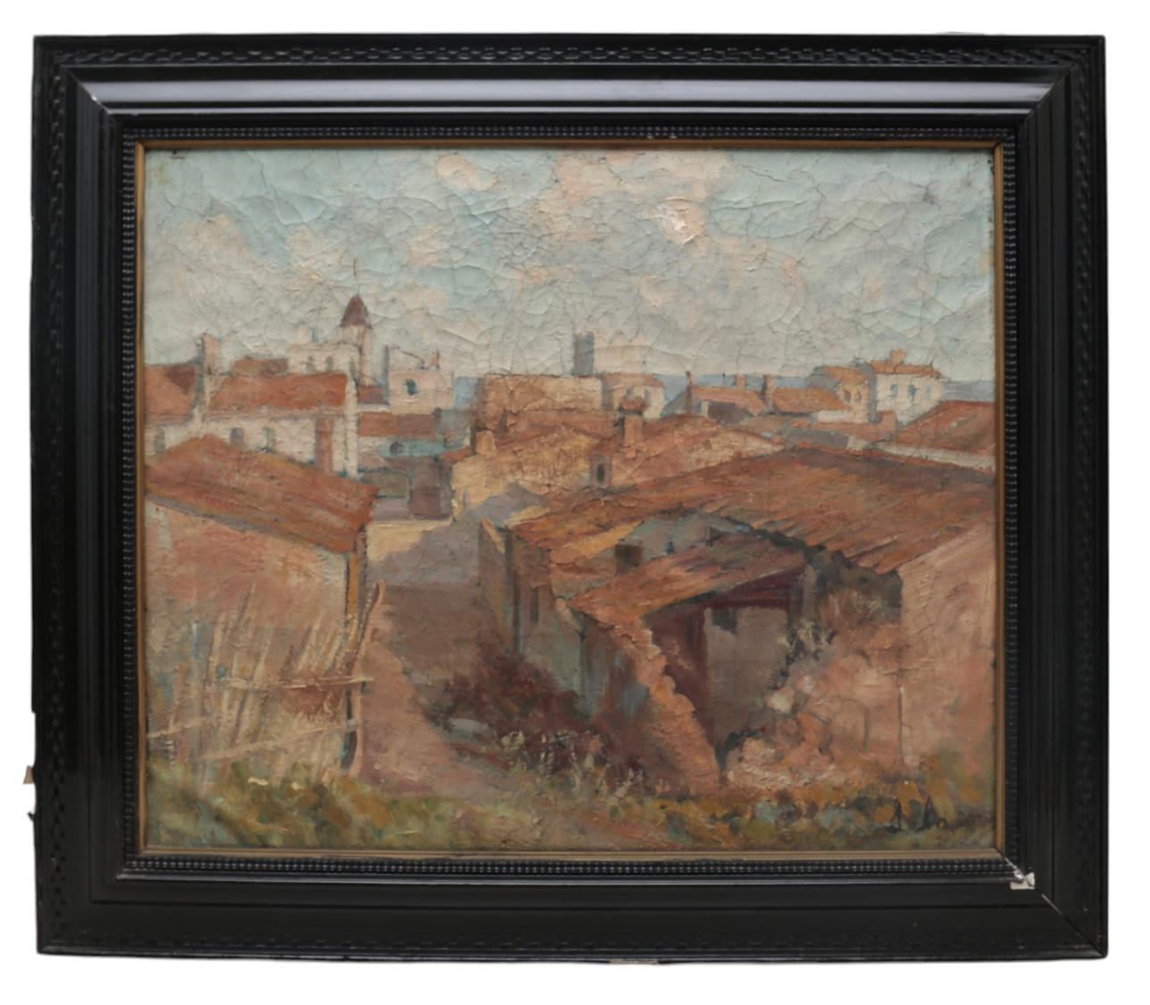 Rikliga sprickor och sprickbildning (särskilt i övre delen). Eboniserad träram.