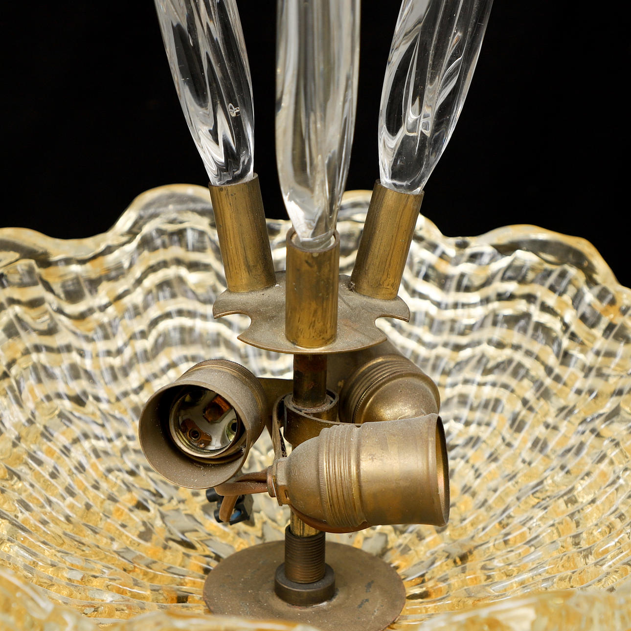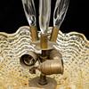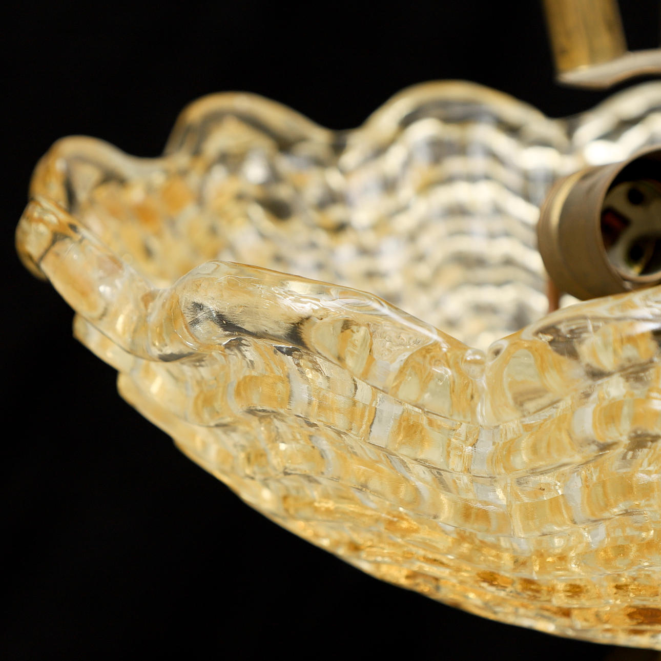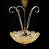 Gultonad skärm i pressar glas. 3 st blad i glas. Tre ljuspunkter. Höjd ca 57 cm. Diameter 37 cm.