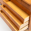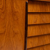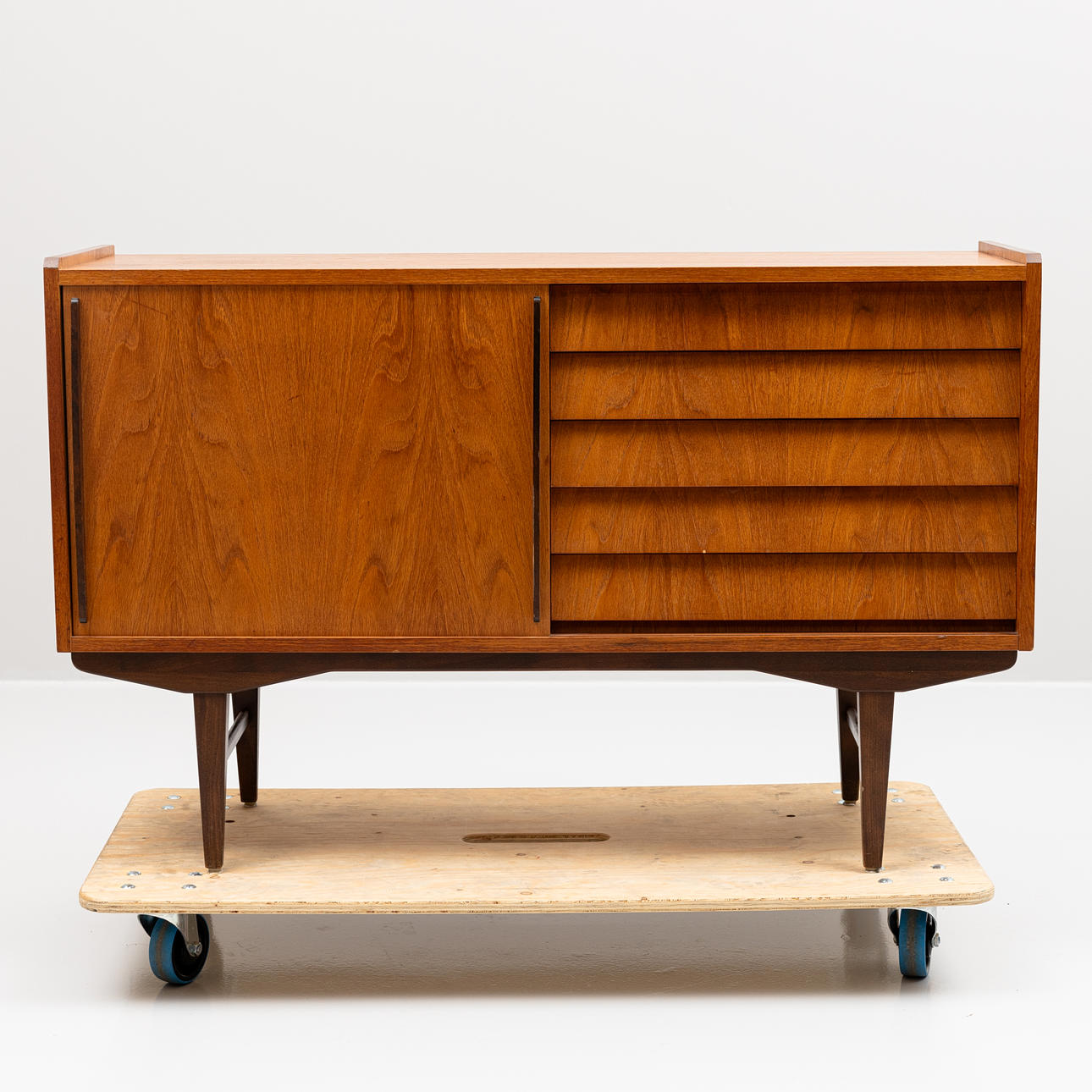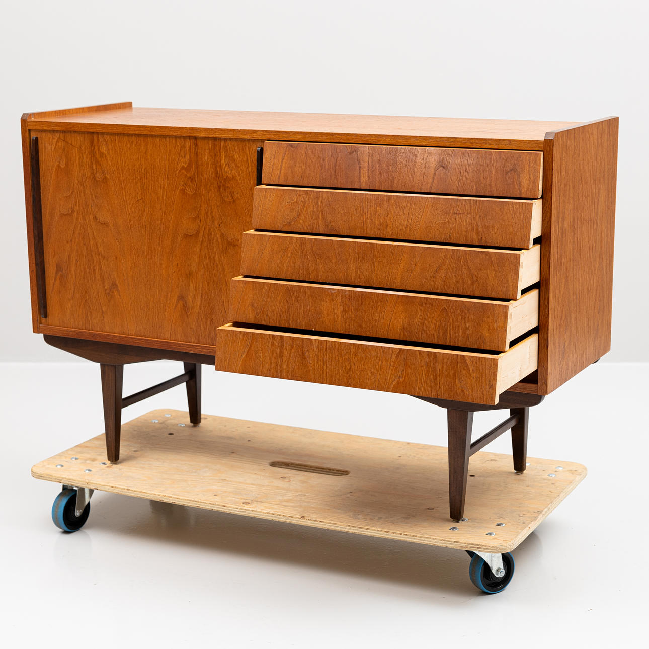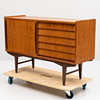 Skjutdörr med bakomliggande inredning. 5 lådor. Längd ca 128, bredd 42, höjd 82 cm.