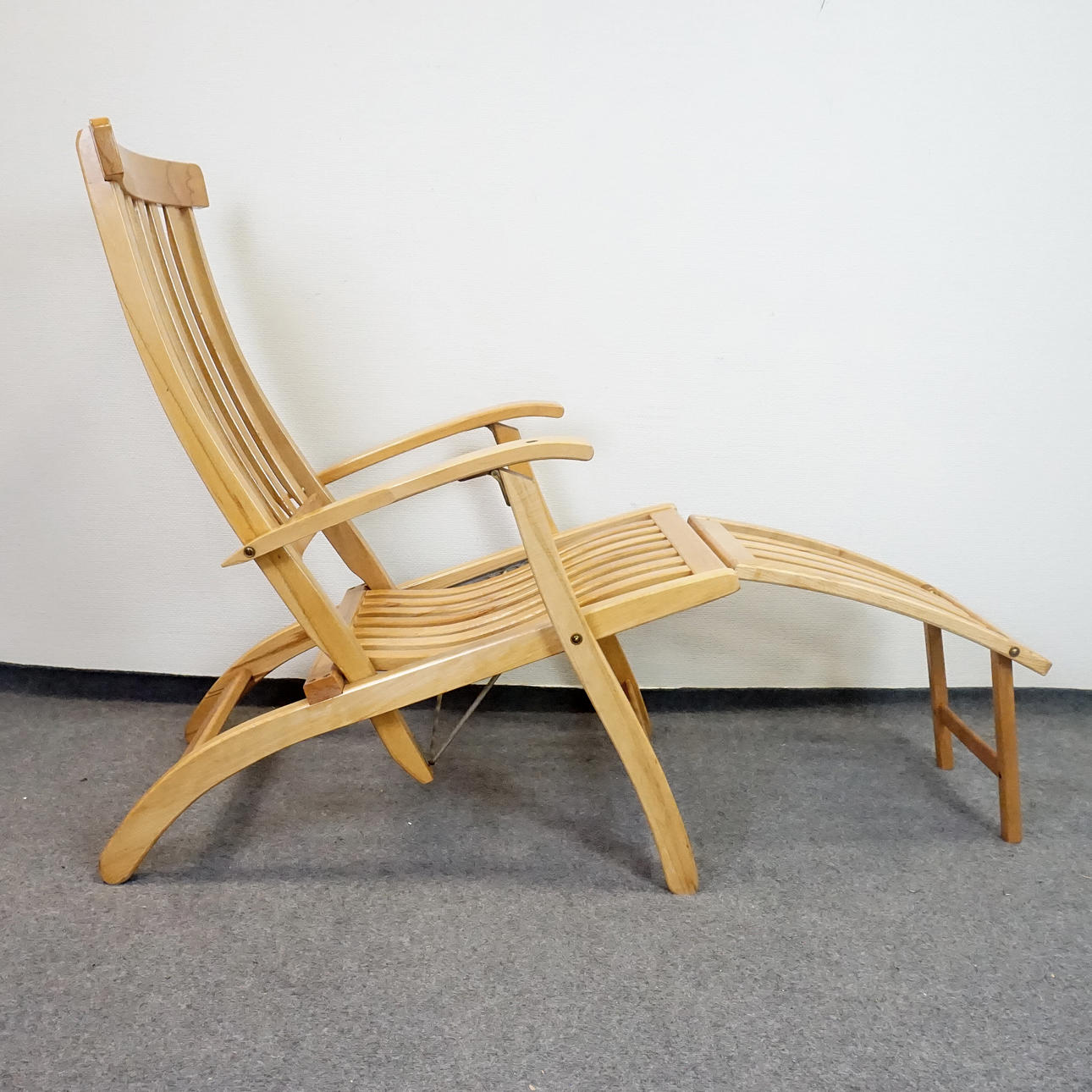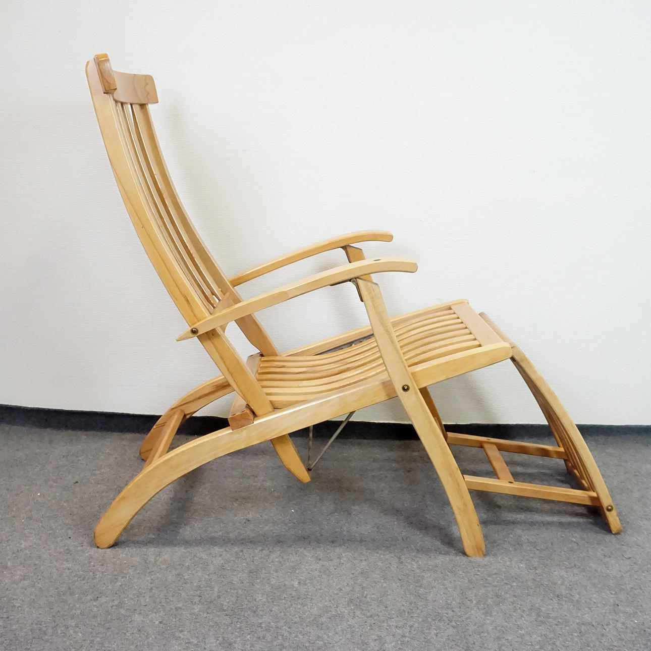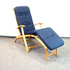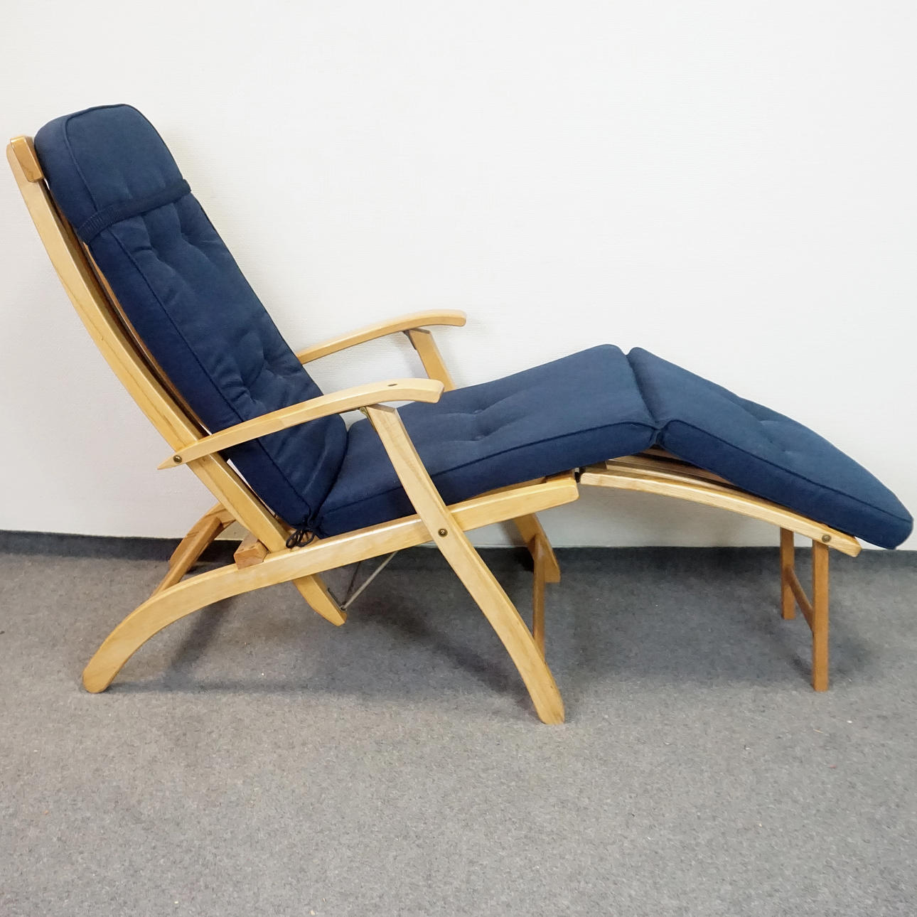 Däckstol med fotstöd och dyna, märkt Stockamöllan baksidan ryggstöd. Bricka saknas.