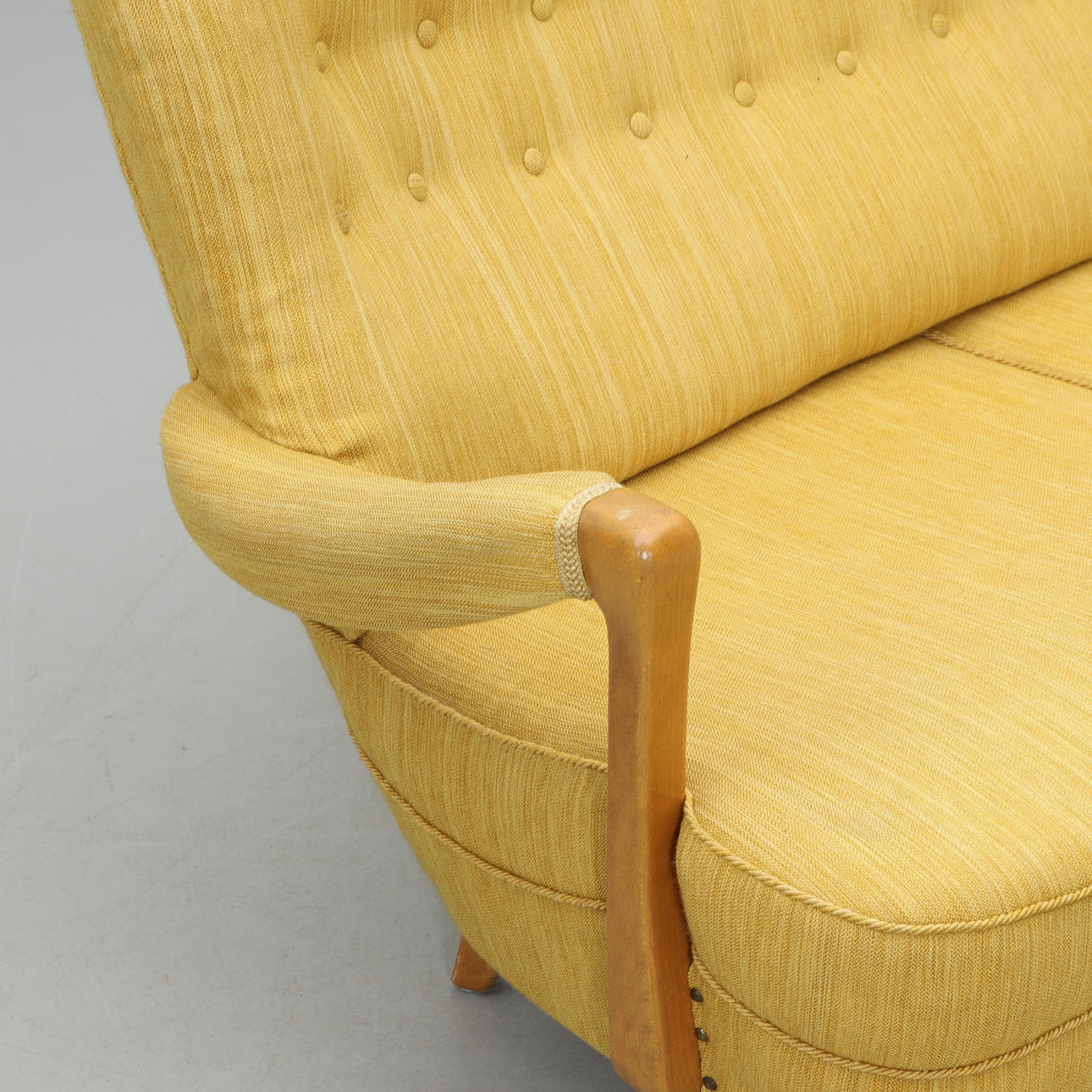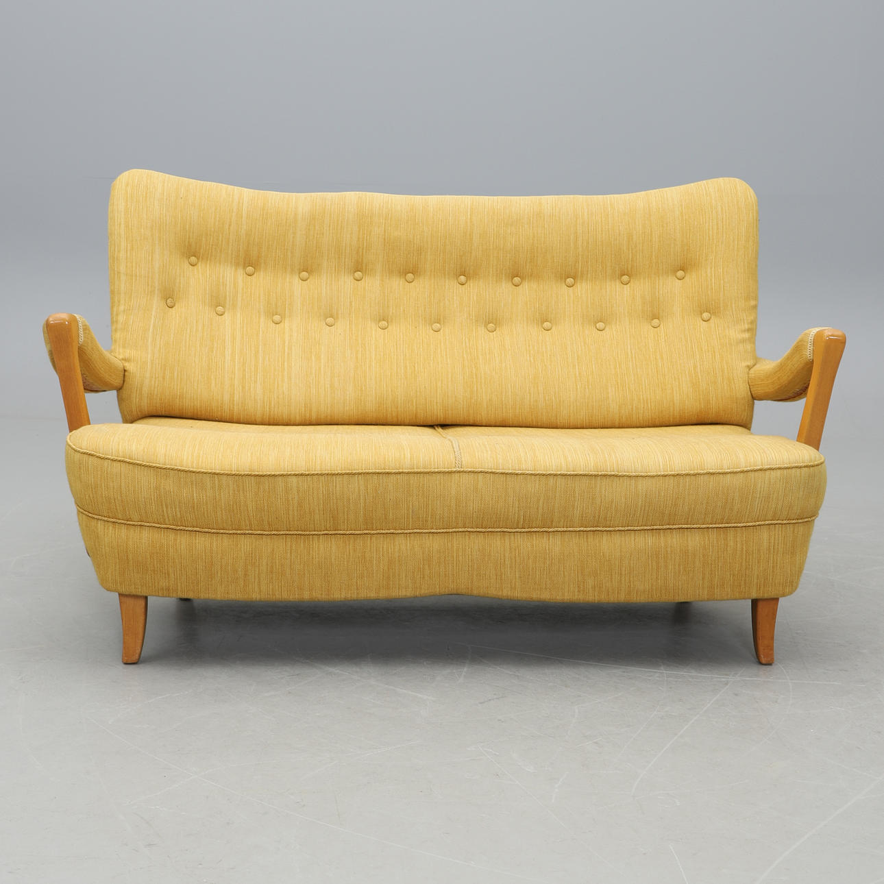 Stoppad rygg och sits, knapphäftad rygg, karmar i bok. Längd 148, djup c:a 70, höjd c:a 90 cm.