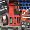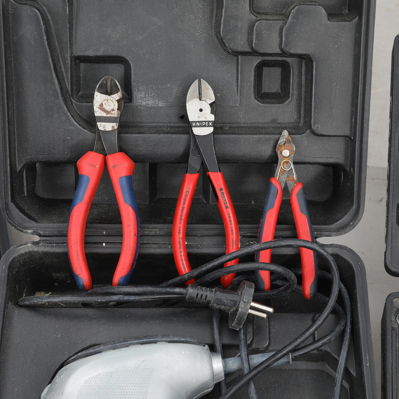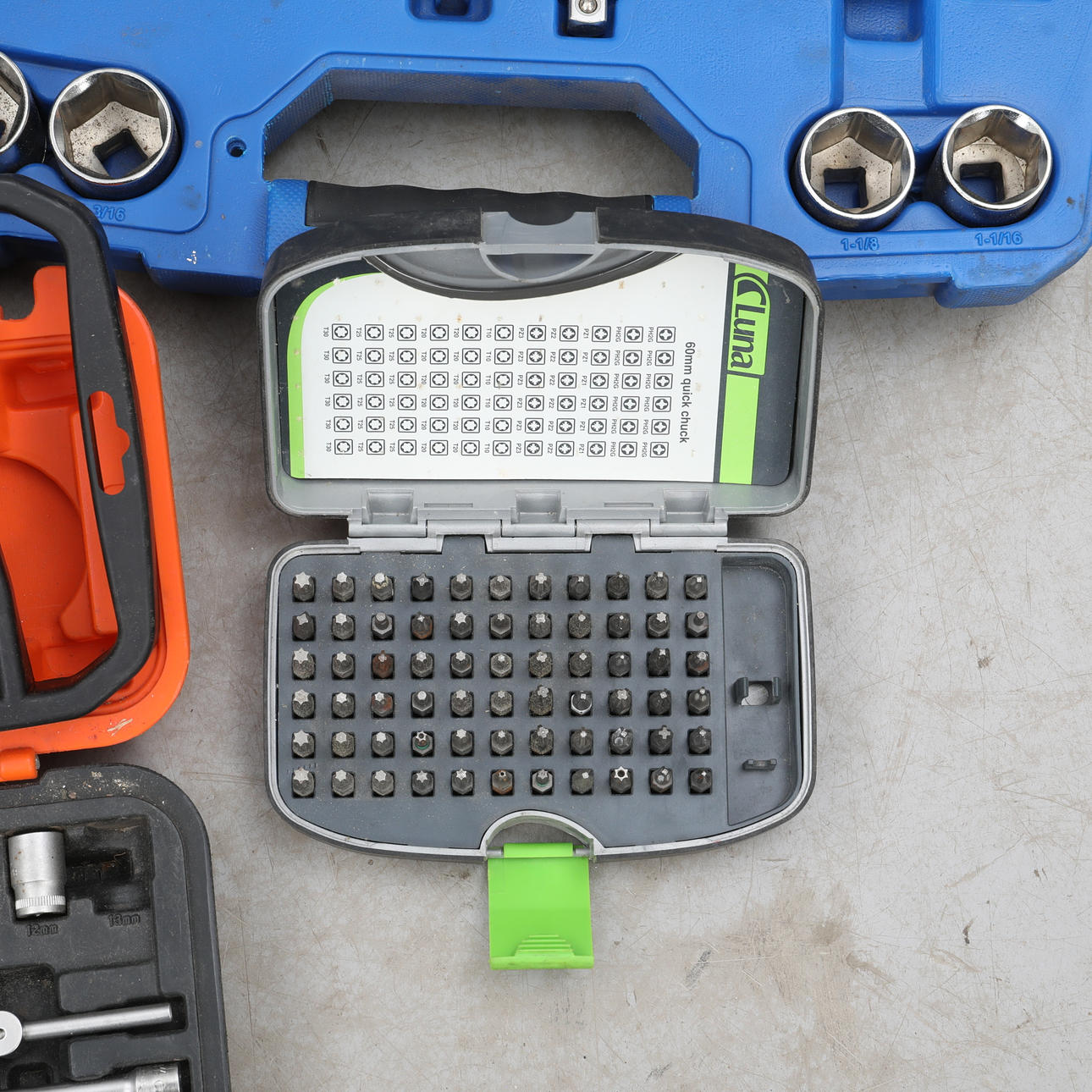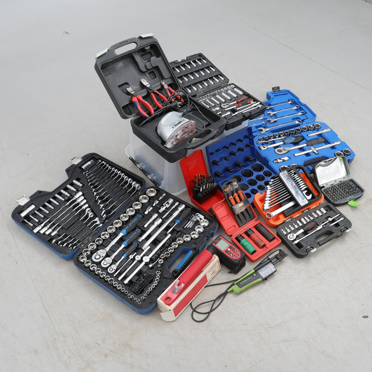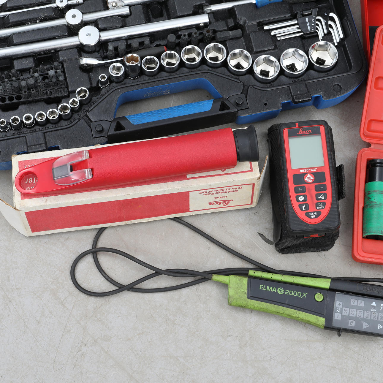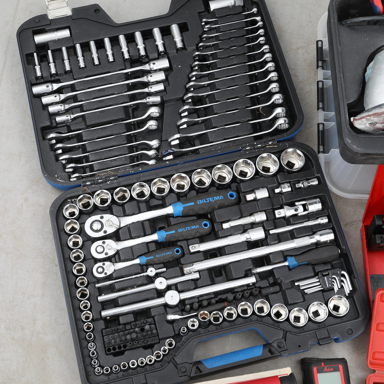Bitssatser Fasta nycklar Spärrskaftslåda med bitsar,hylsor m.m Batteritestare Leica Krafthylsor 3st Könare Avståndsmätare Leica.