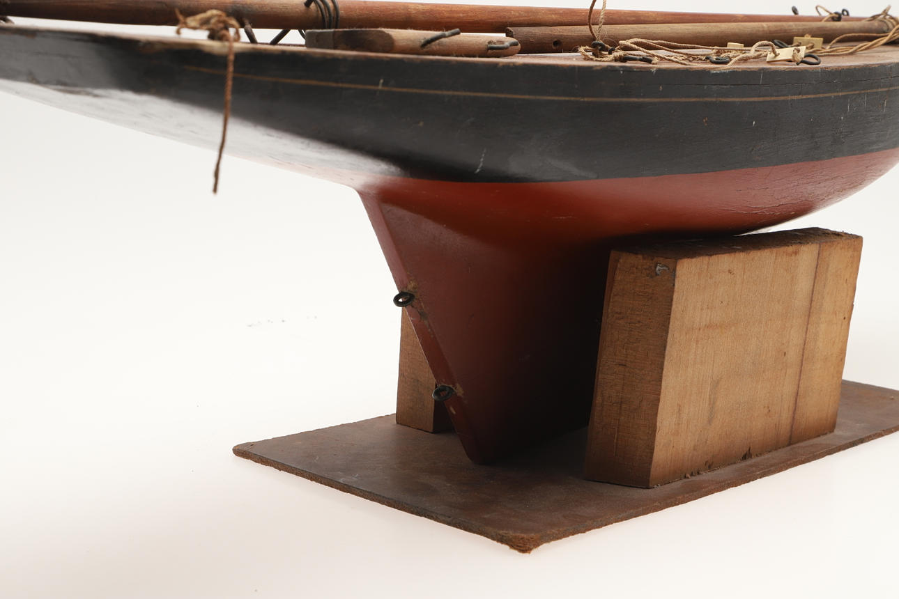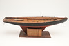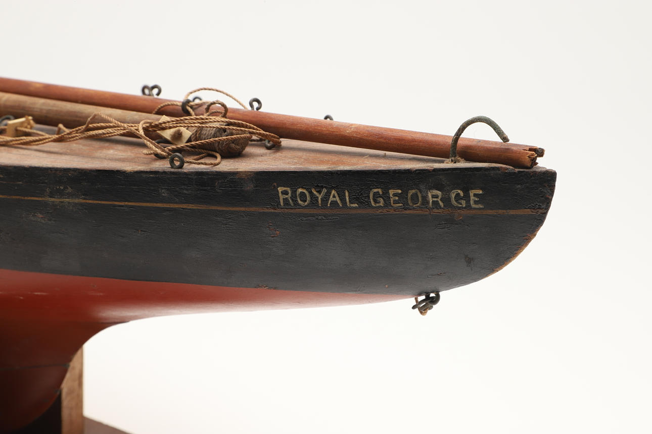 En trädammyacht med titeln ”Royal George”, med riggning, segel och ett träställ. Skrov 62cm lång.