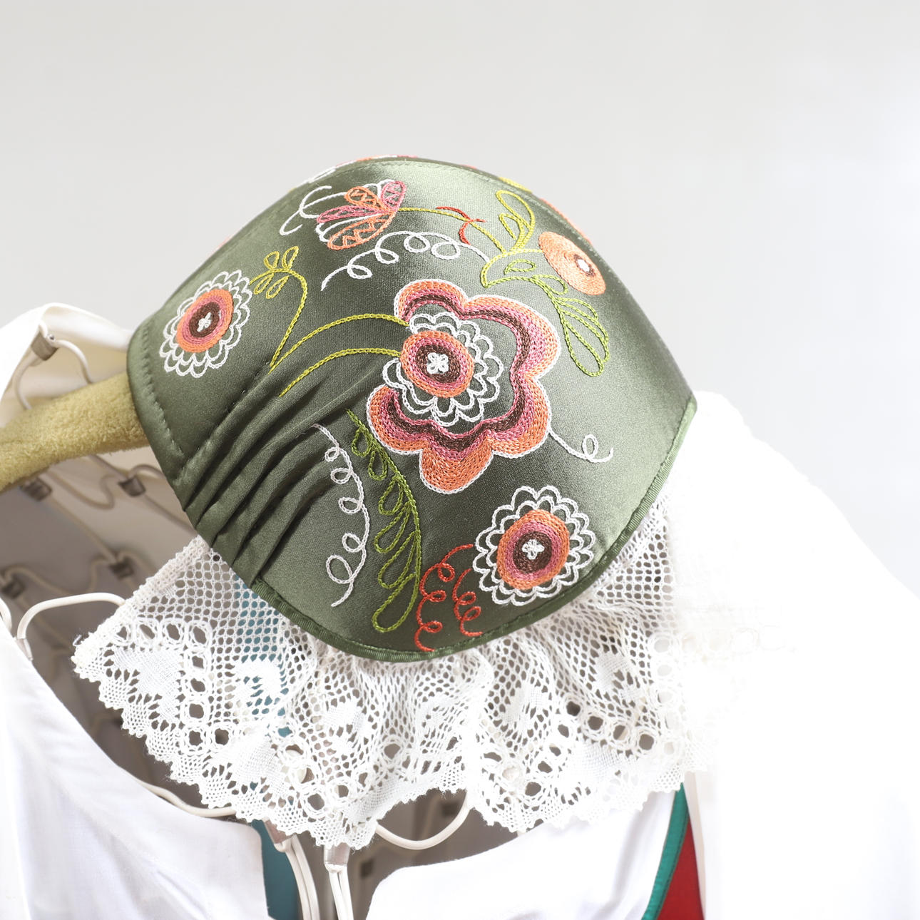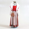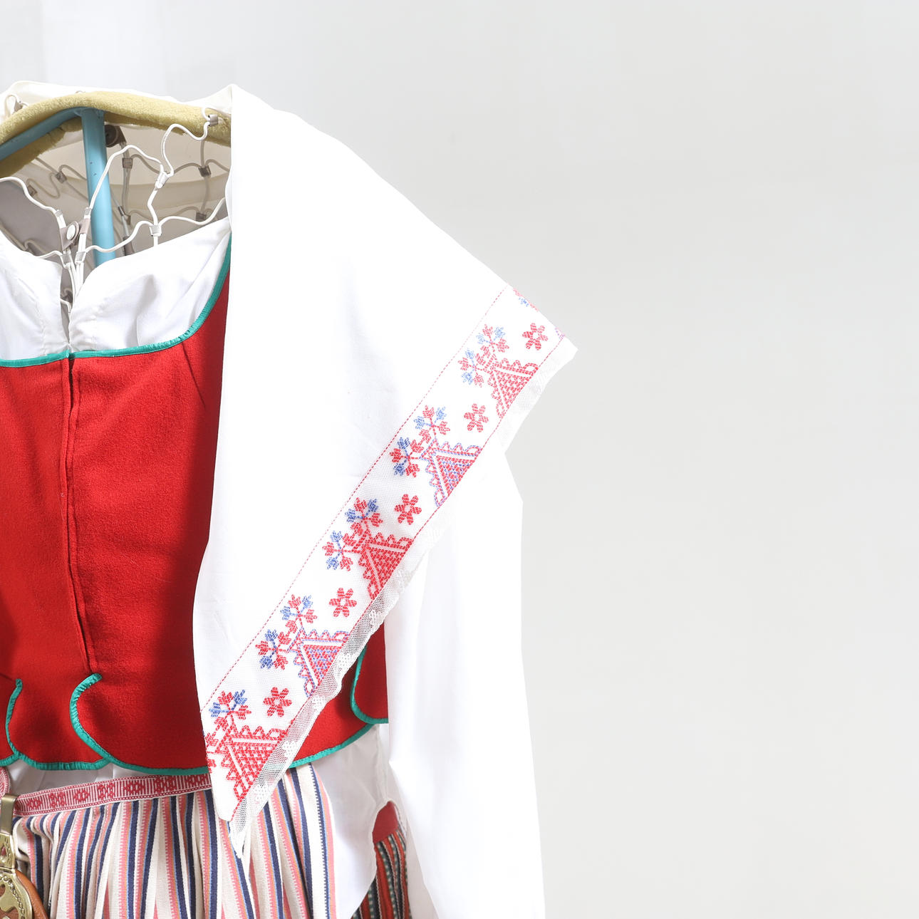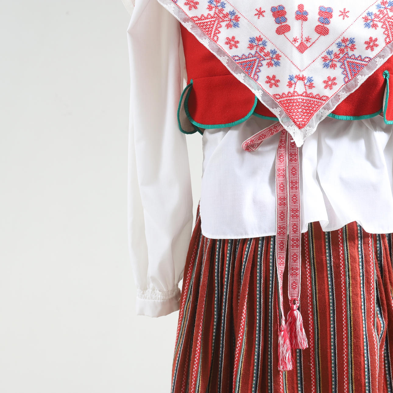 Vit blus. Rött livstycke med grön kantband. Randig kjol samt förkläde. Tillhörande underkjol. Halskläde med brodyr i rött och grönt. Kjolväska i läder med applikationsbroderi och mässingsbygel. Med bindmössa samt huvudduk.
