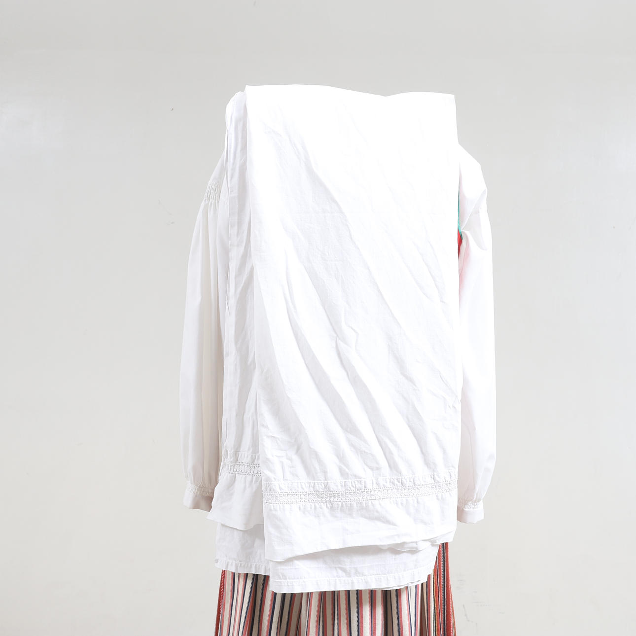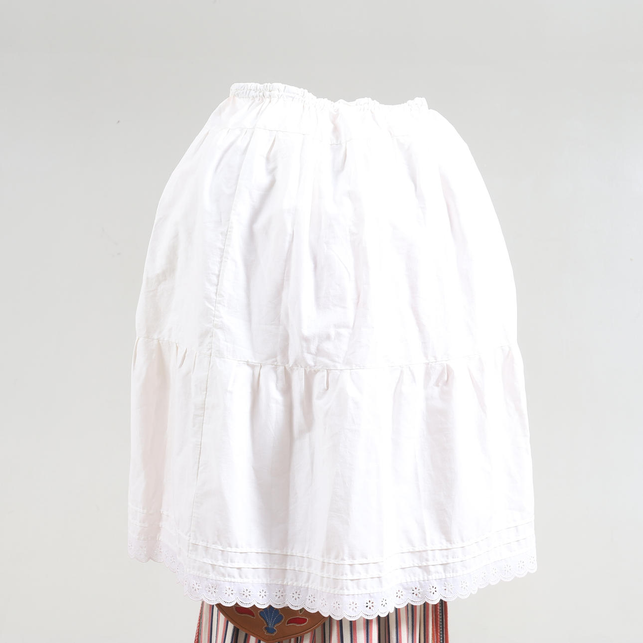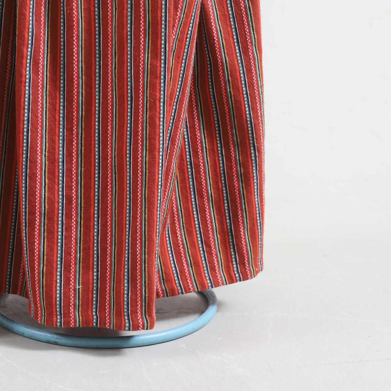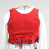 Vit blus. Rött livstycke med grön kantband. Randig kjol samt förkläde. Tillhörande underkjol. Halskläde med brodyr i rött och grönt. Kjolväska i läder med applikationsbroderi och mässingsbygel. Med bindmössa samt huvudduk.