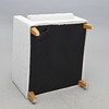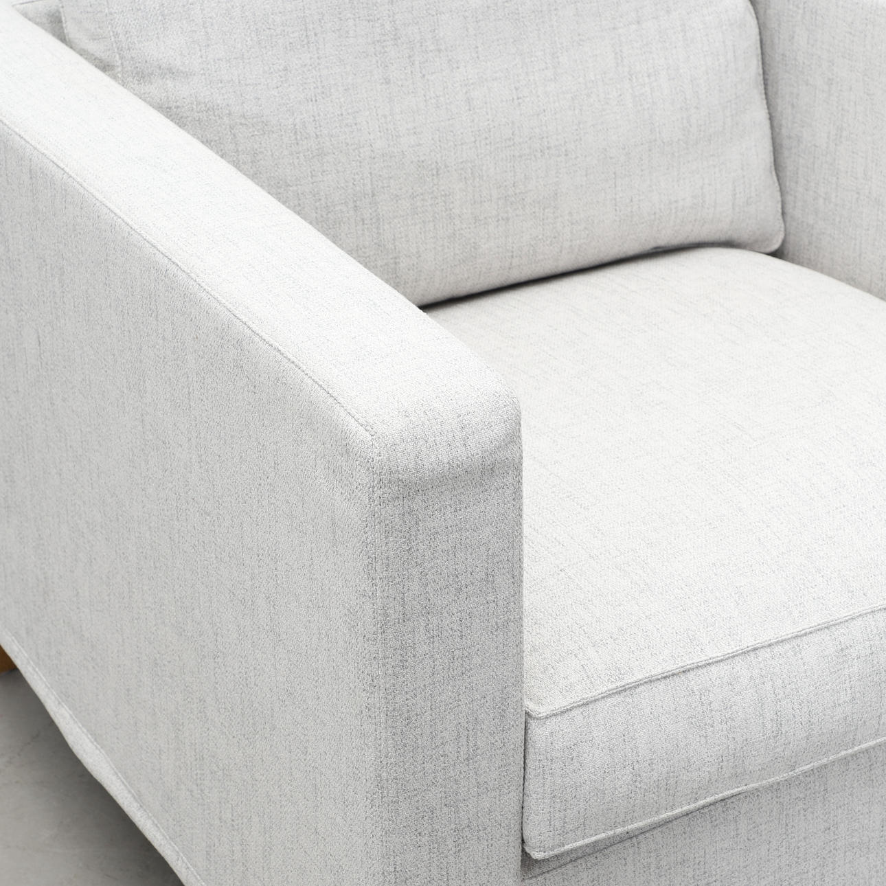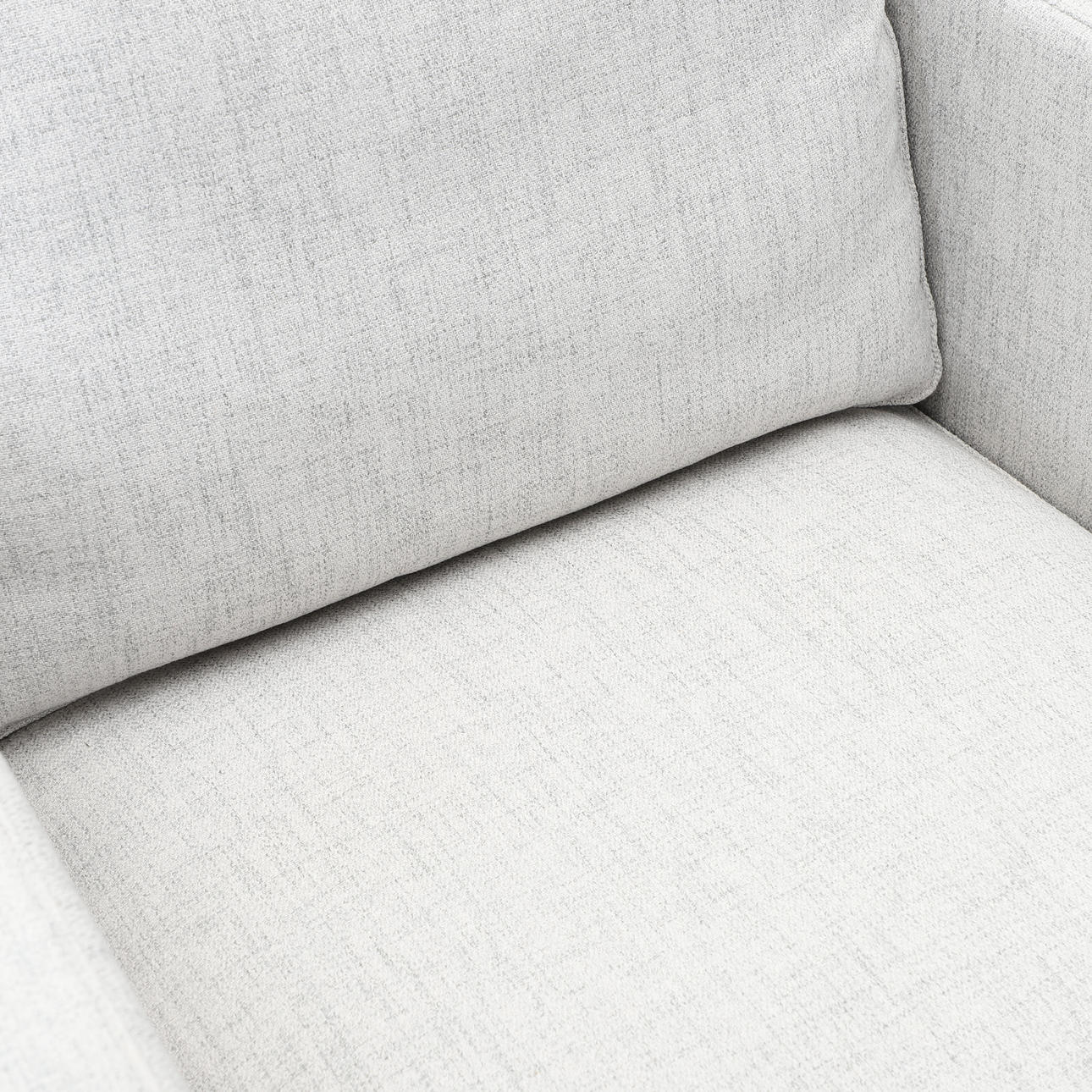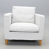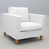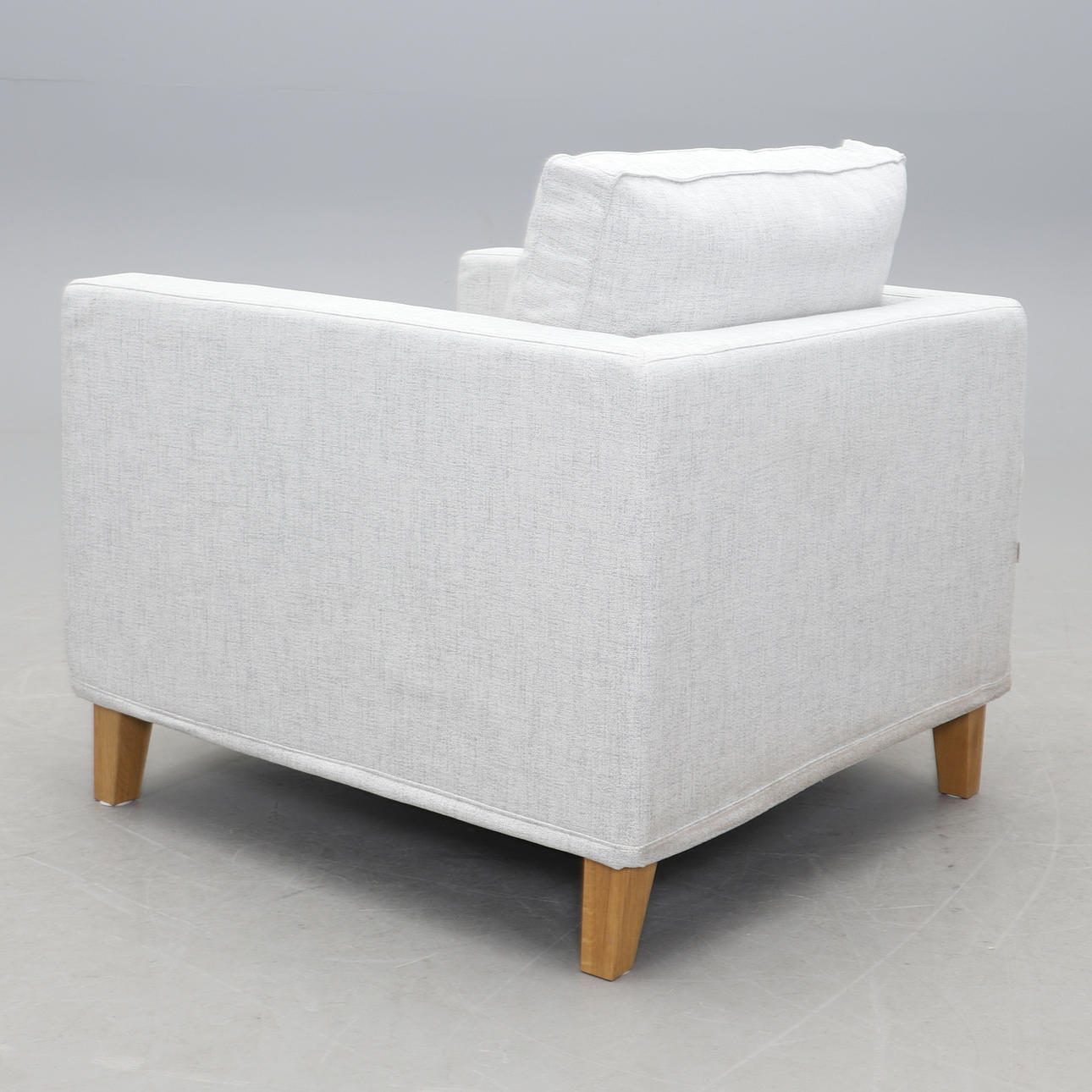 Ljusgrå textilklädsel, lösa dynor i sits och rygg. Sitthöjd ca 44, rygghöjd ca 85, fast höjd 67, bredd 85, djup 93 cm.