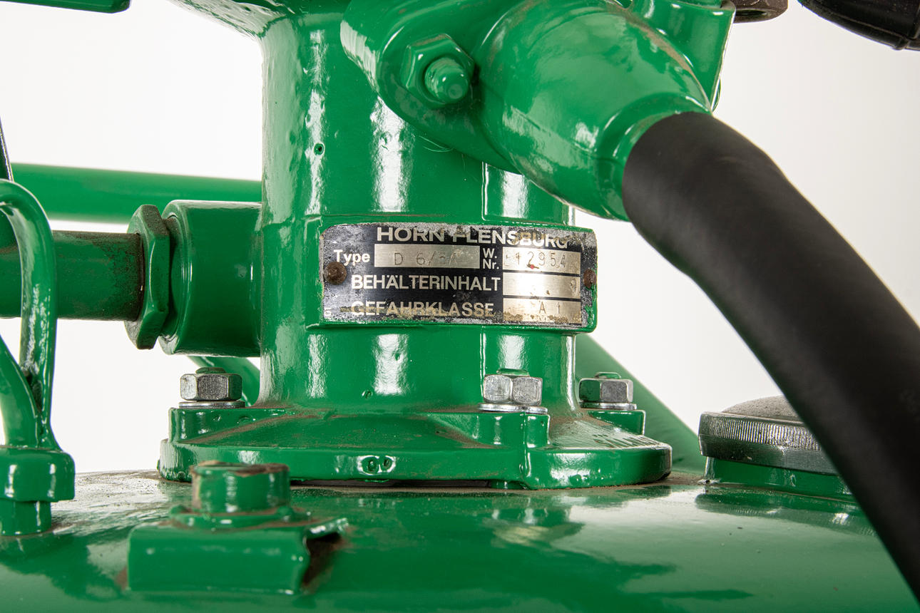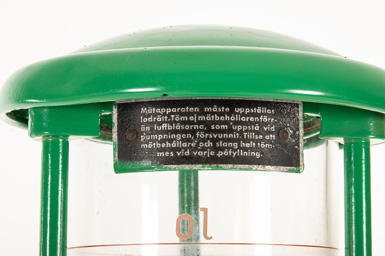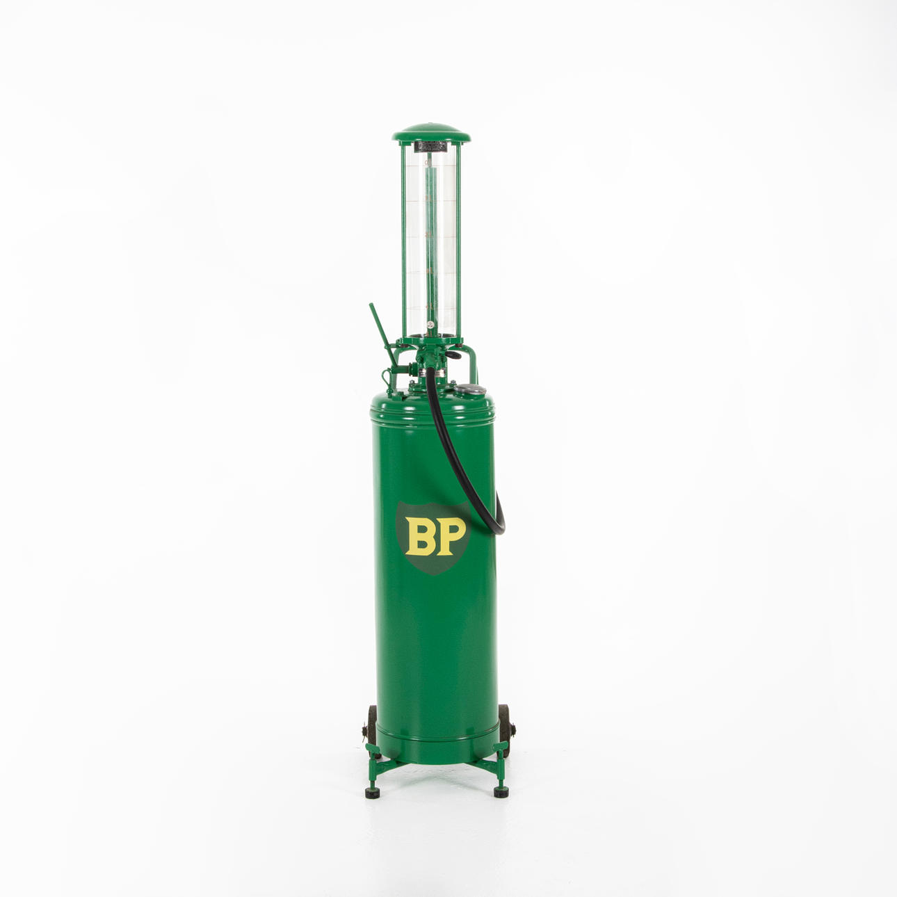 Bensinpump BP med glasinsats, gummihjul, har använts till 2-taktsbensin, 1950-tal