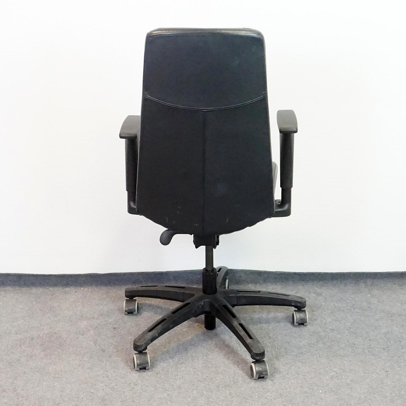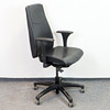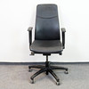 Kontorsstol i svart läder. Höj- och sänkbar rygg, sits samt armstöd Rygghöjd 54 cm, sitthöjd 40-54 cm, sittdjup 41 cm.