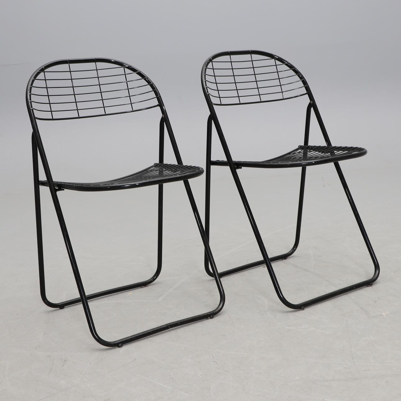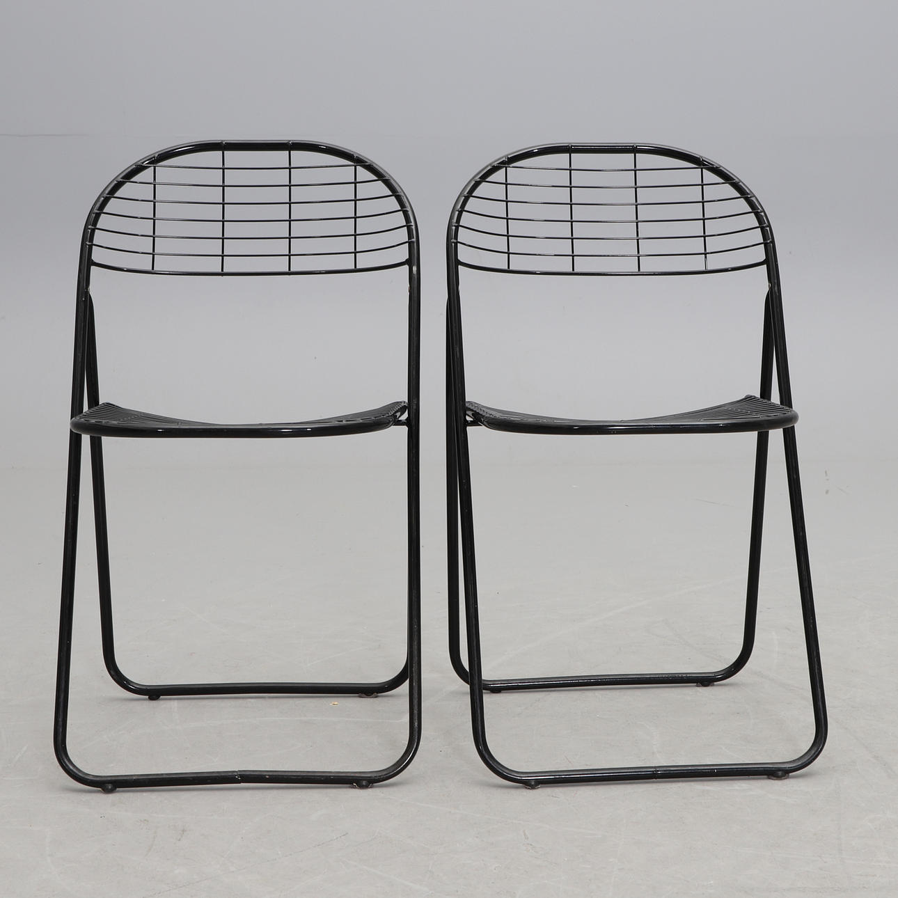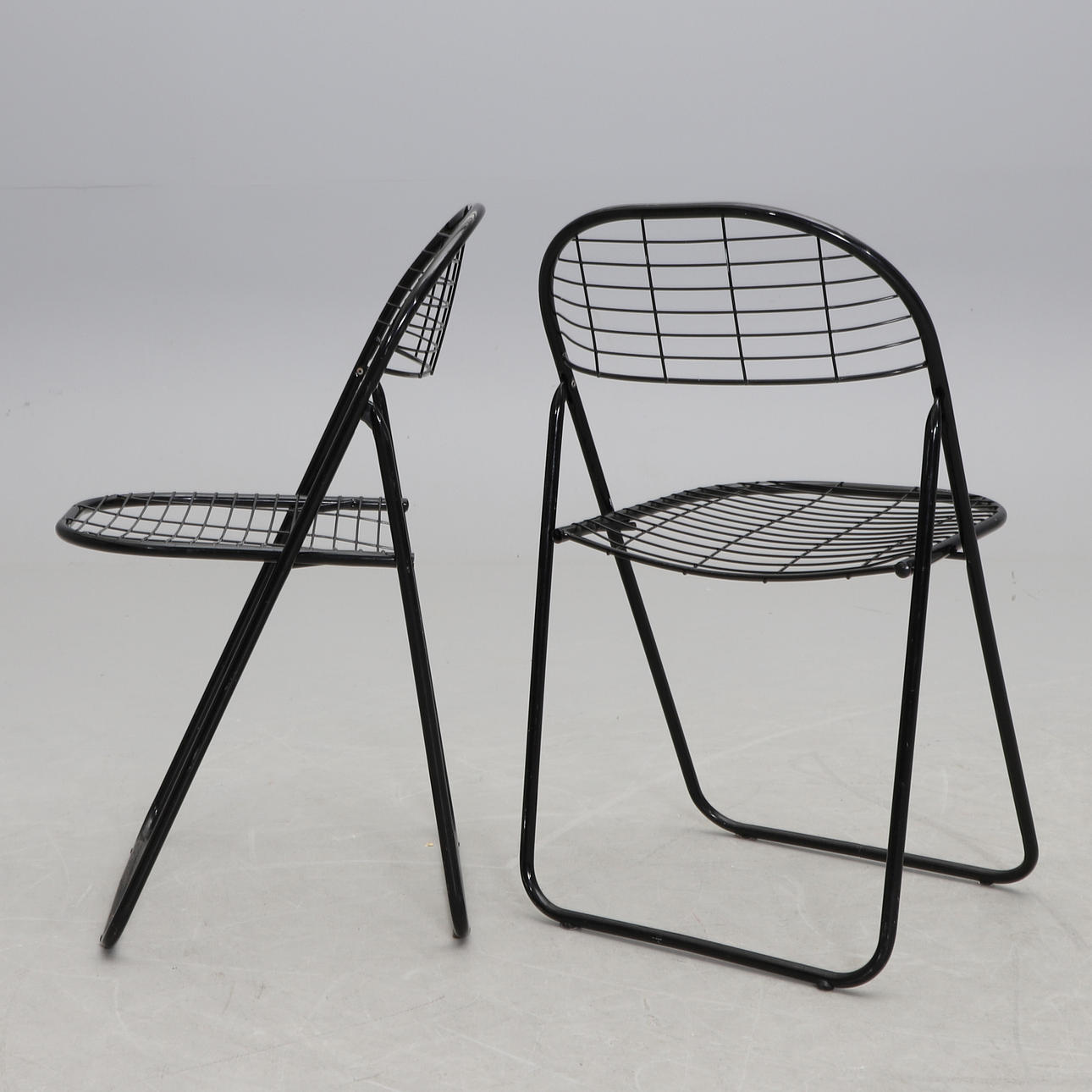 Svartlackerat metallrutnät. Hopfällbara. Bredd 46, hopfälld höjd 91, sitthöjd 45 cm.