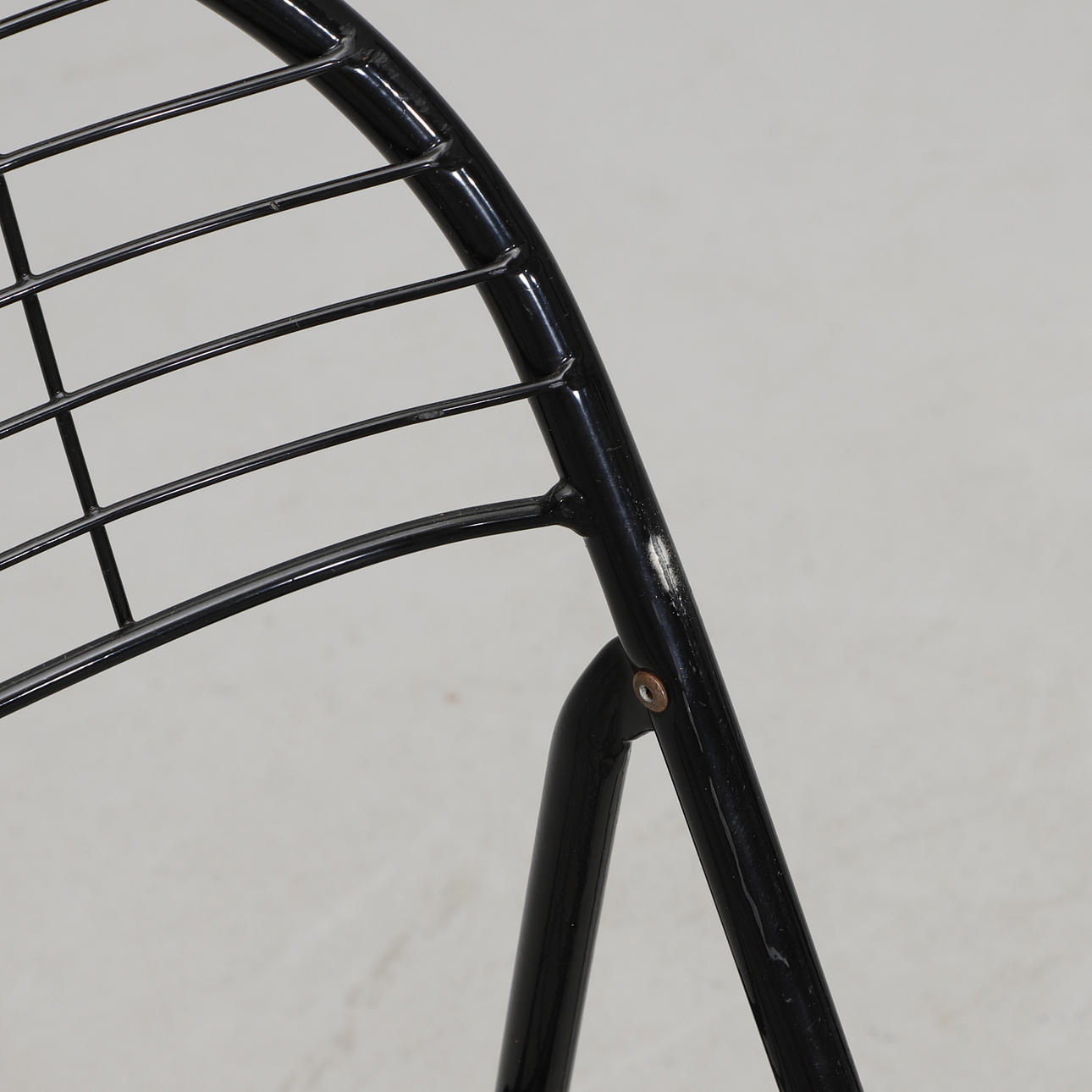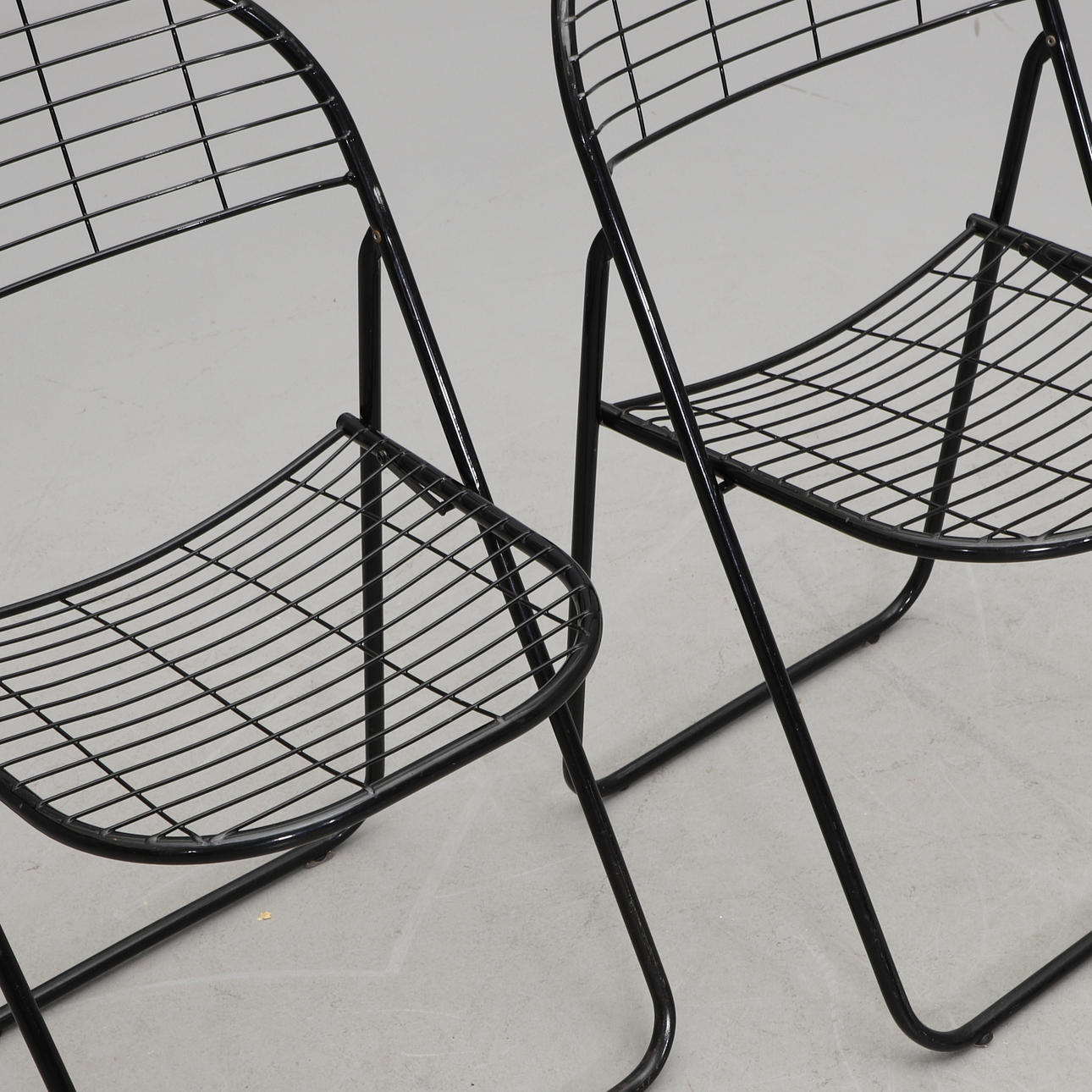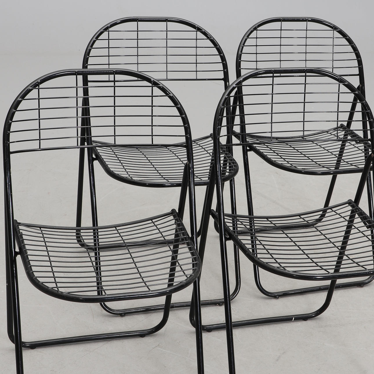 Svartlackerat metallrutnät. Hopfällbara. Bredd 46, hopfälld höjd 91, sitthöjd 45 cm.
