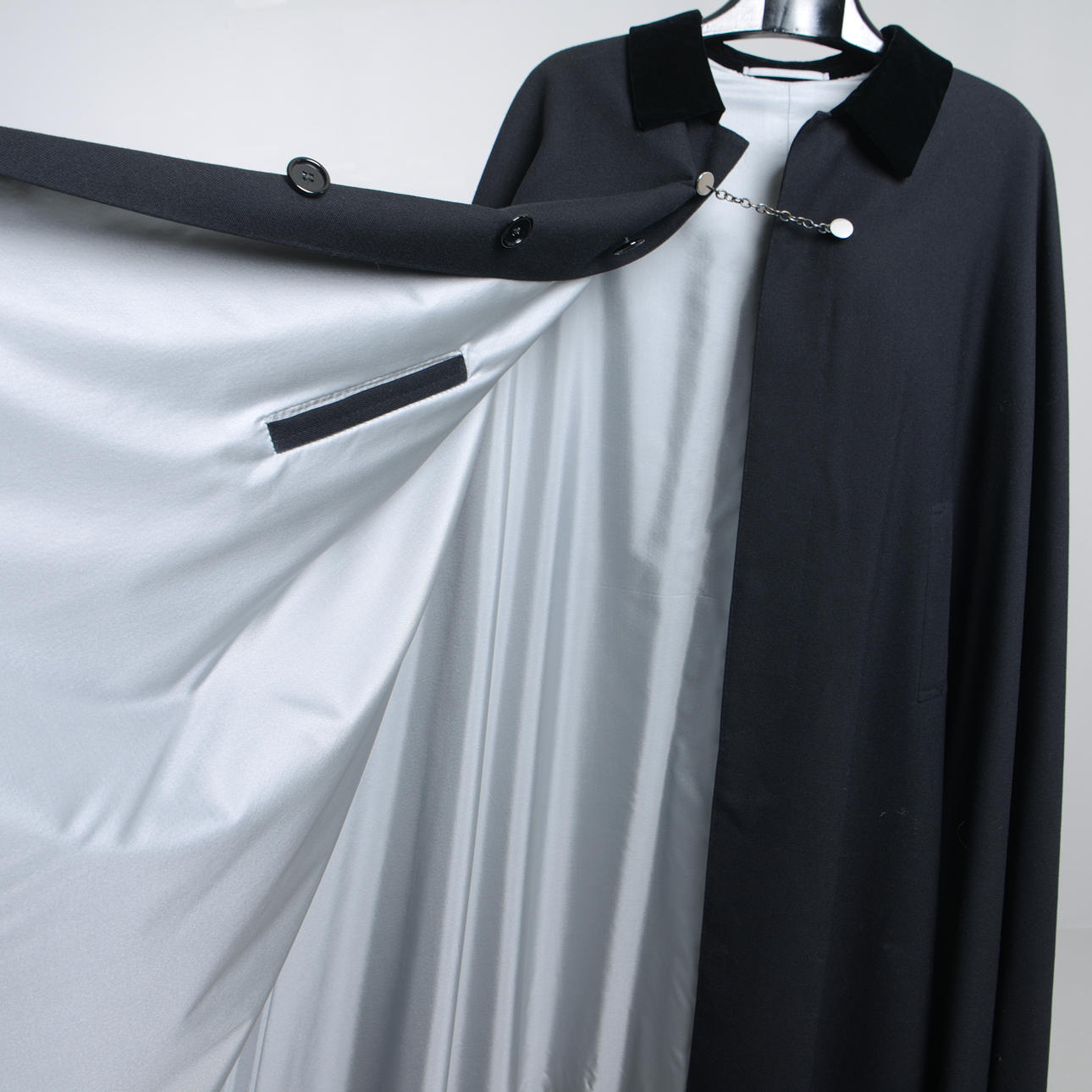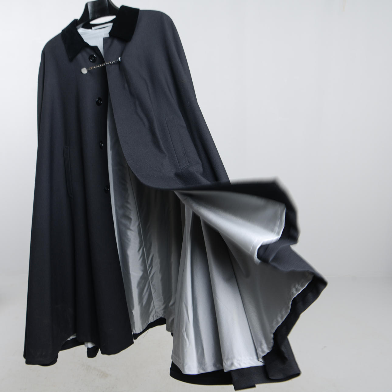 Sannolikt ateljesydd. Cape/Slängkappa utan ärm för att komplettera frack eller smoking-utstyrsel. Ylle och sammet.