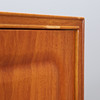 Valnötsplywood och valnöt. I fronten tre dörrar med formpressad rutdekor. Inredning med hyllor. Höga, raka kopplade ben. Bredd 101, djup 42, höjd 152 cm.