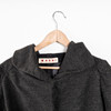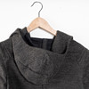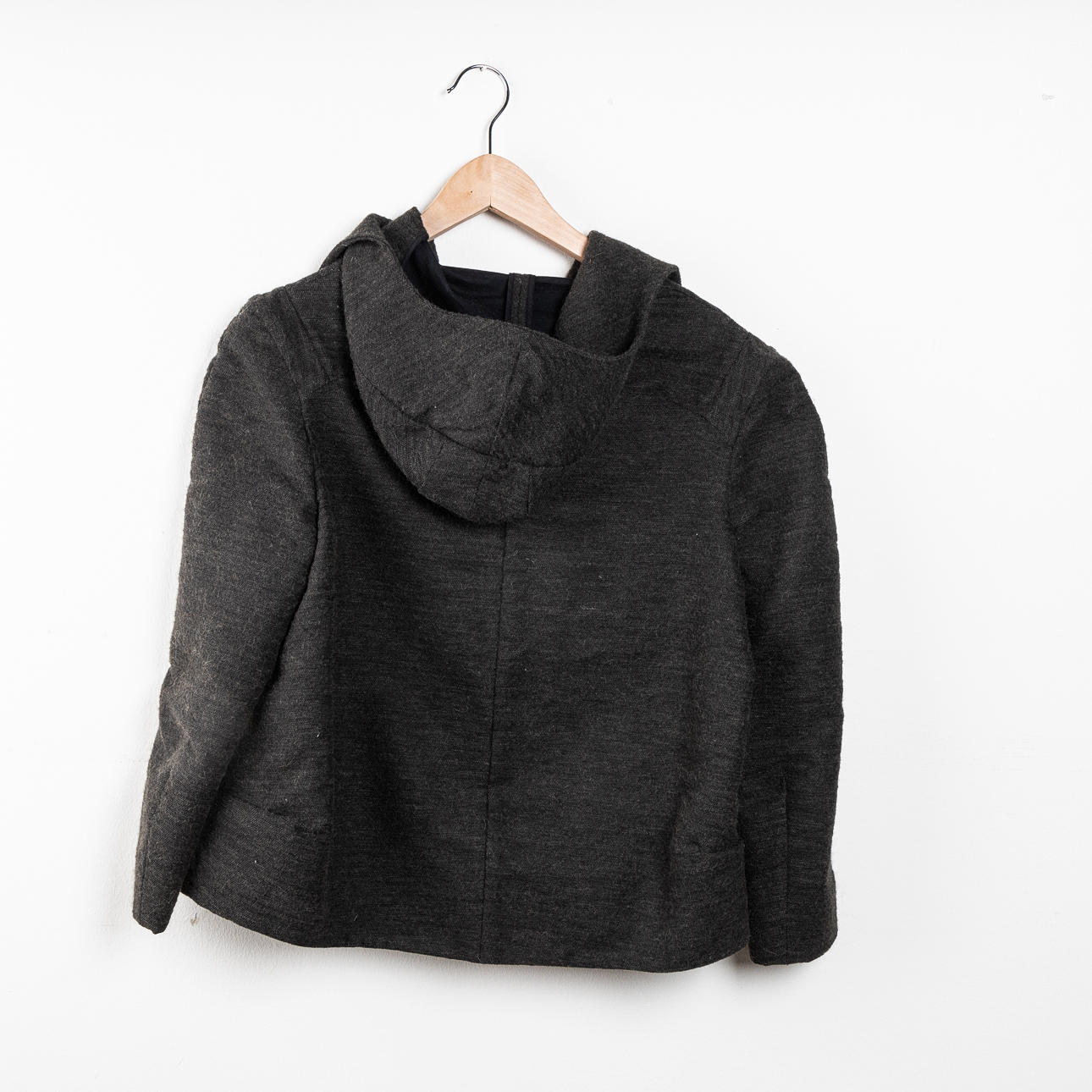 Jacka i alpacka, bomull och nylon, med kapuschong, knäppes med tryckknappar fram. Handfickor i sidan. Bystvidd ca 100 cm, längd ca 50 cm.