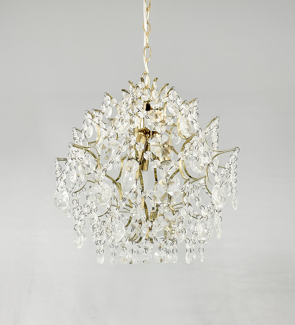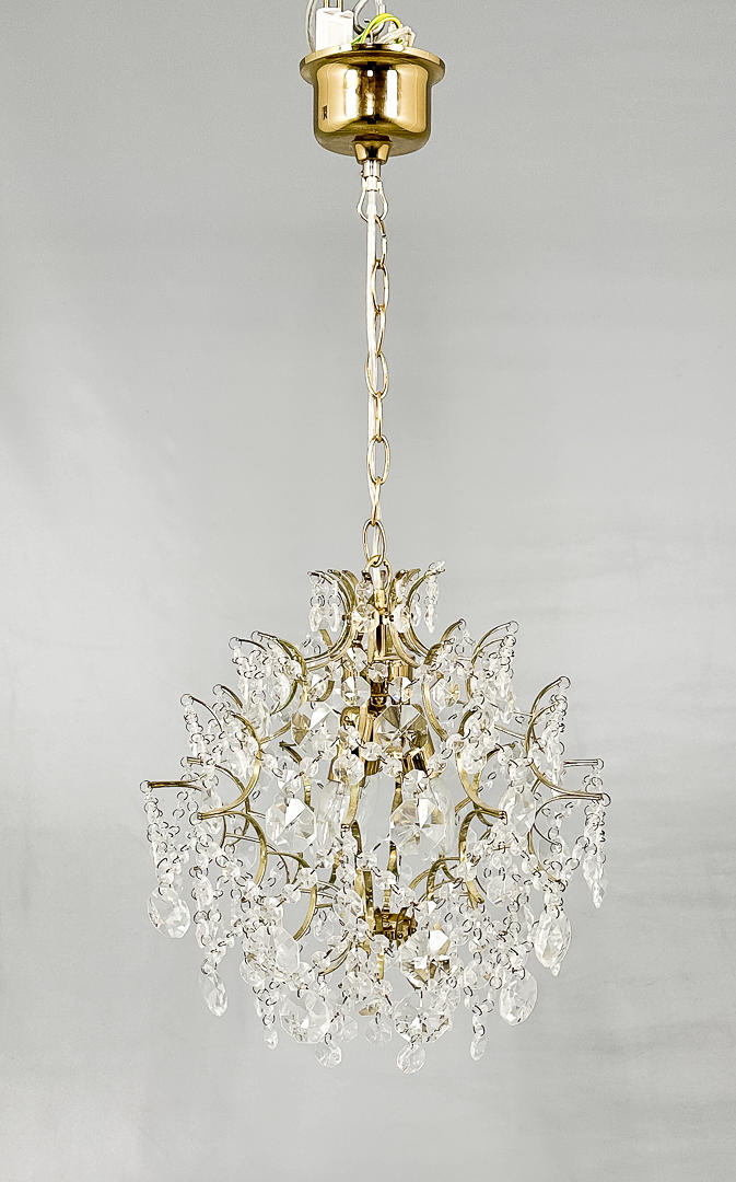Ljuskrona med guldfärgat stomme och maskinskurna prismor. Diameter 40 cm, höjd ca 80 cm. Etikettmärkt.