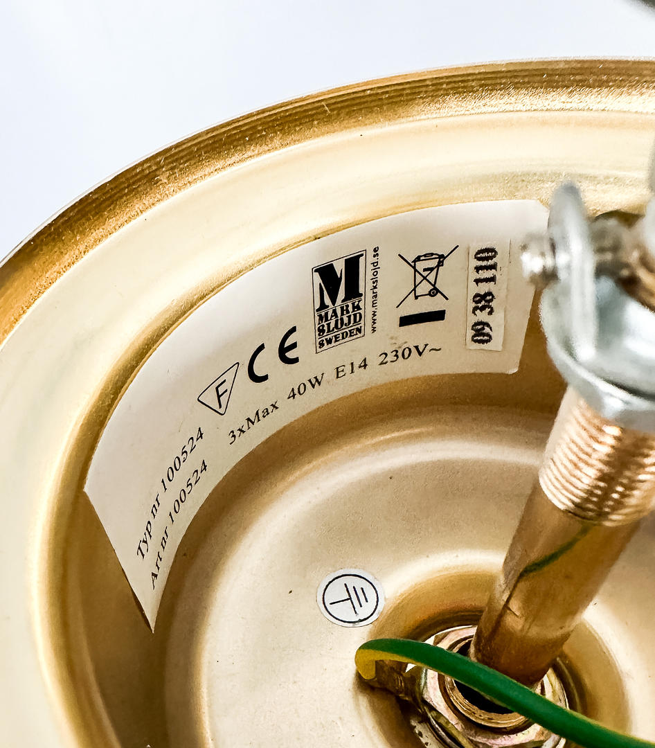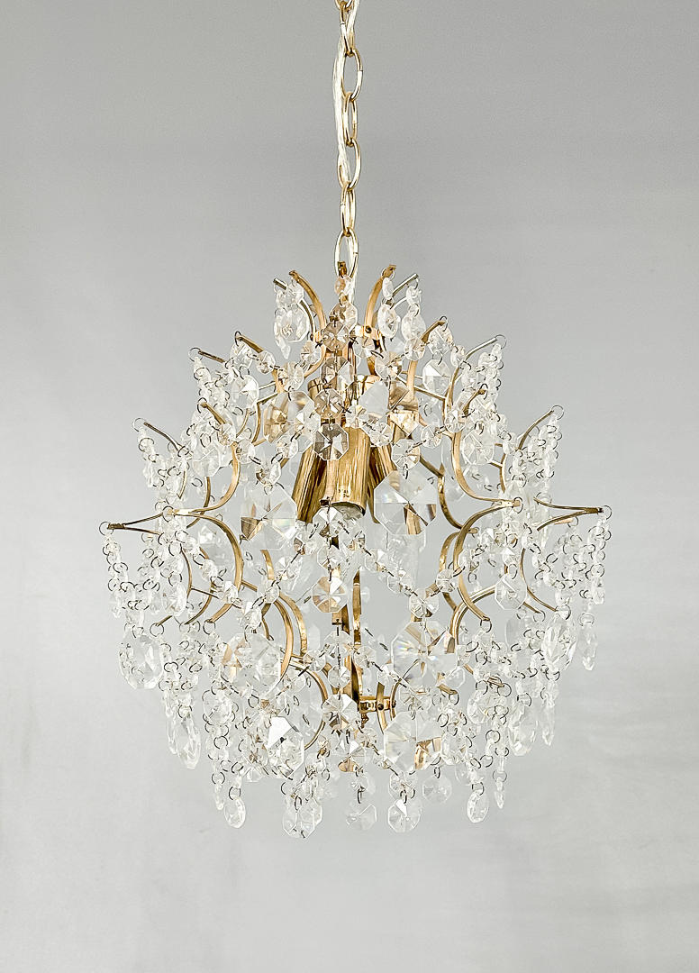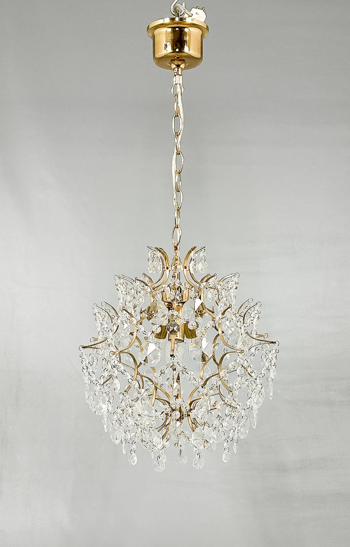 Kristallkrona med maskinskurna prismor, guldfärgat stomme. Diameter ca 40 cm, höjd ca 80 cm. Etikettmärkt.