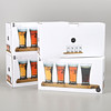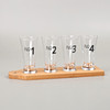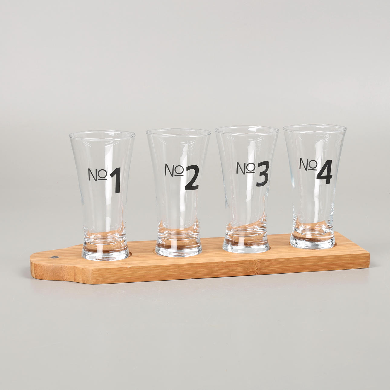 Fyra förpackningar med fyra ölglas och en bricka i varje förpackning. Totalt 16 glas och 4 brickor. Glas, höjd ca 13 cm. Träbrickor, mått 33x10 cm.