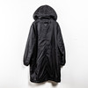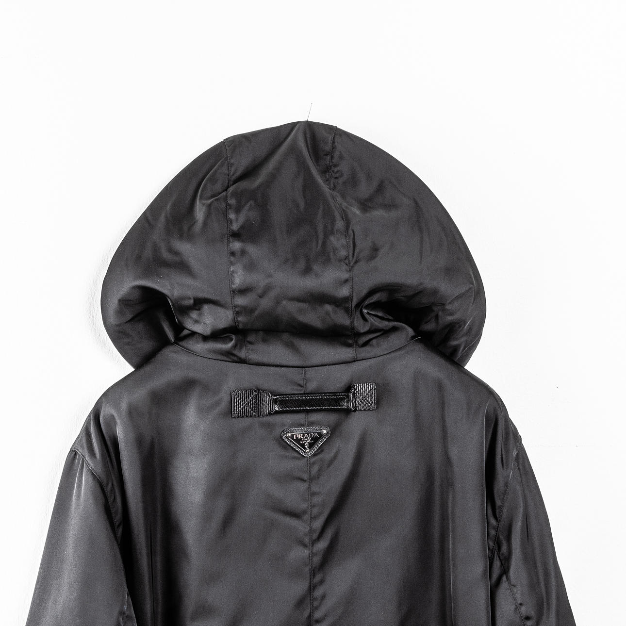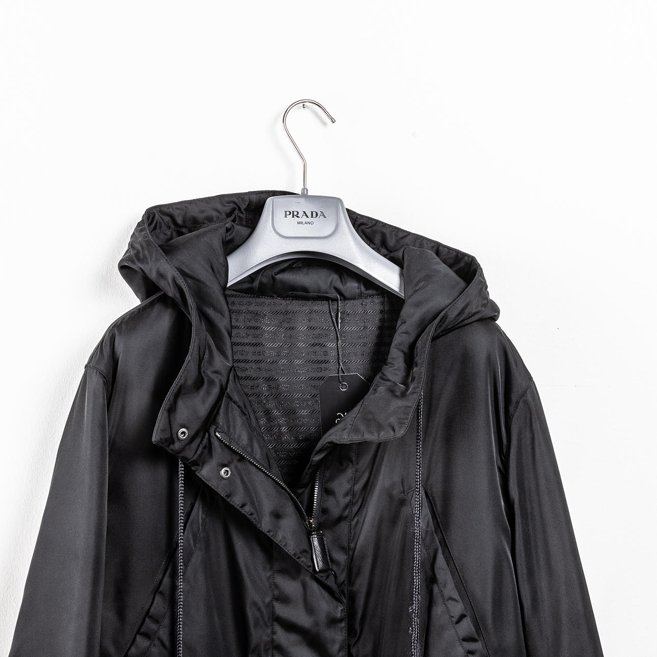Parkas i svart polyester, med fast kapuschong, två fickor med lock samt två snedställda fickor. Kanal i midjan för skärp. Ärmavslut med resår. Knäppes med blixtlås samt vindlås med tryckknappar. Detaljer i svart saffinoläder. Invändigt logomönstrat foder. Märkt med plakett. PRADA MILANO.