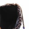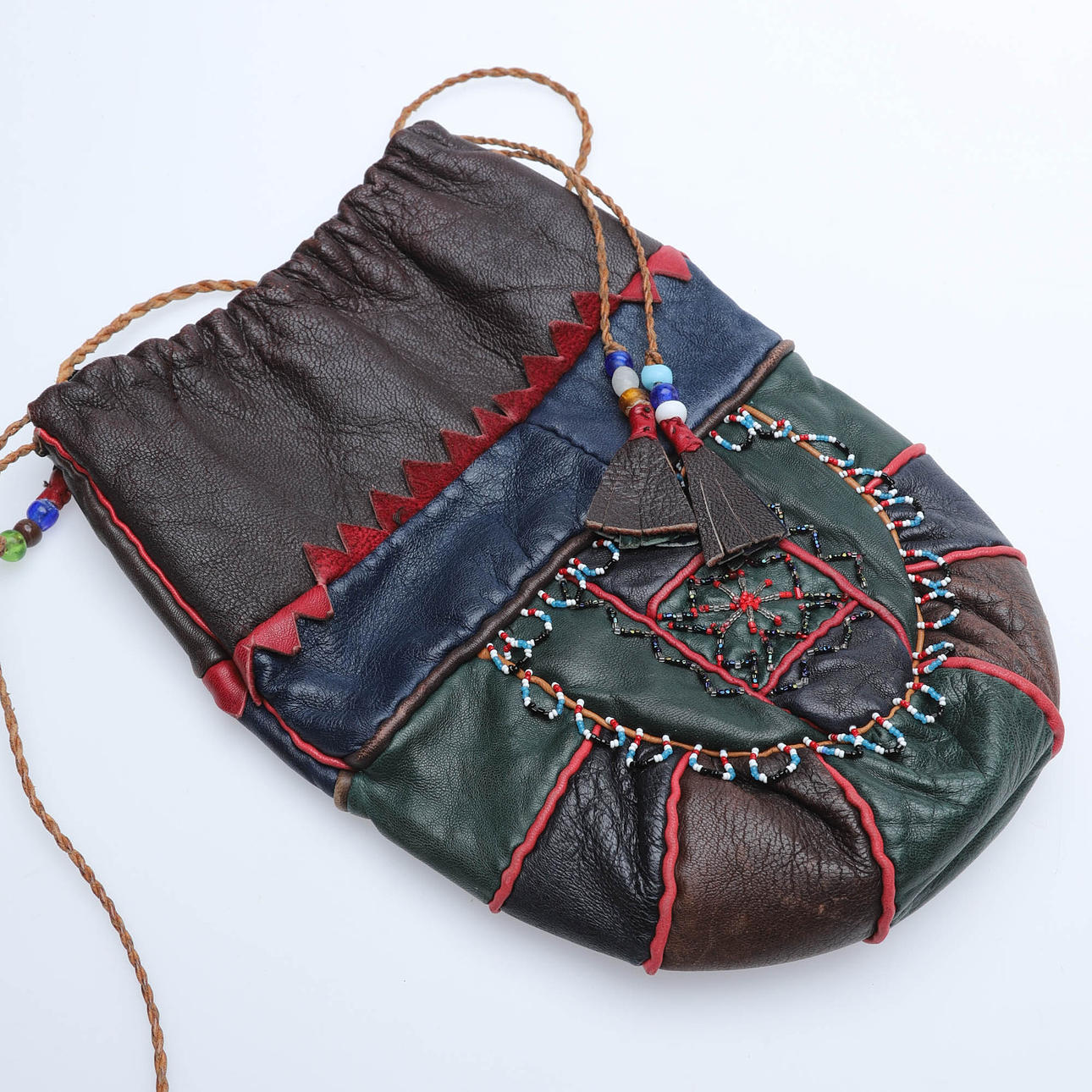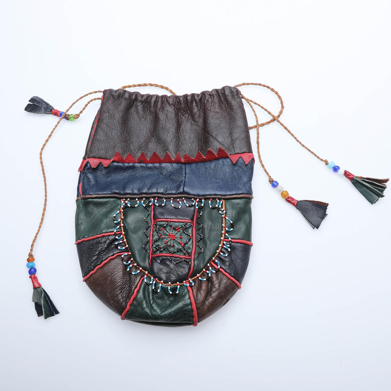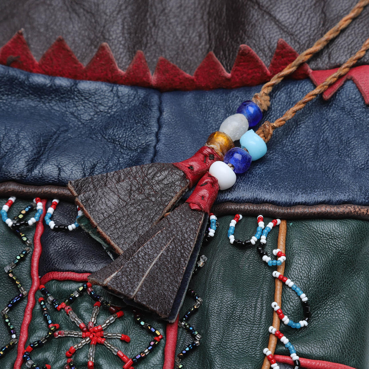 Sydd i flera olikfärgade partier, skinn. Med pärlbroderier på båda sidor. Tvinnad snodd med pärlor och skinntofs.