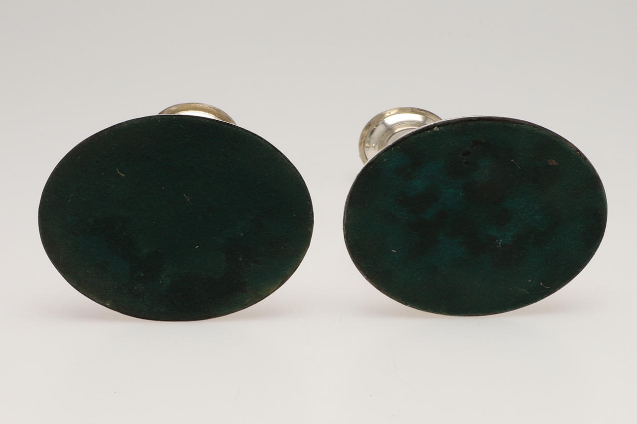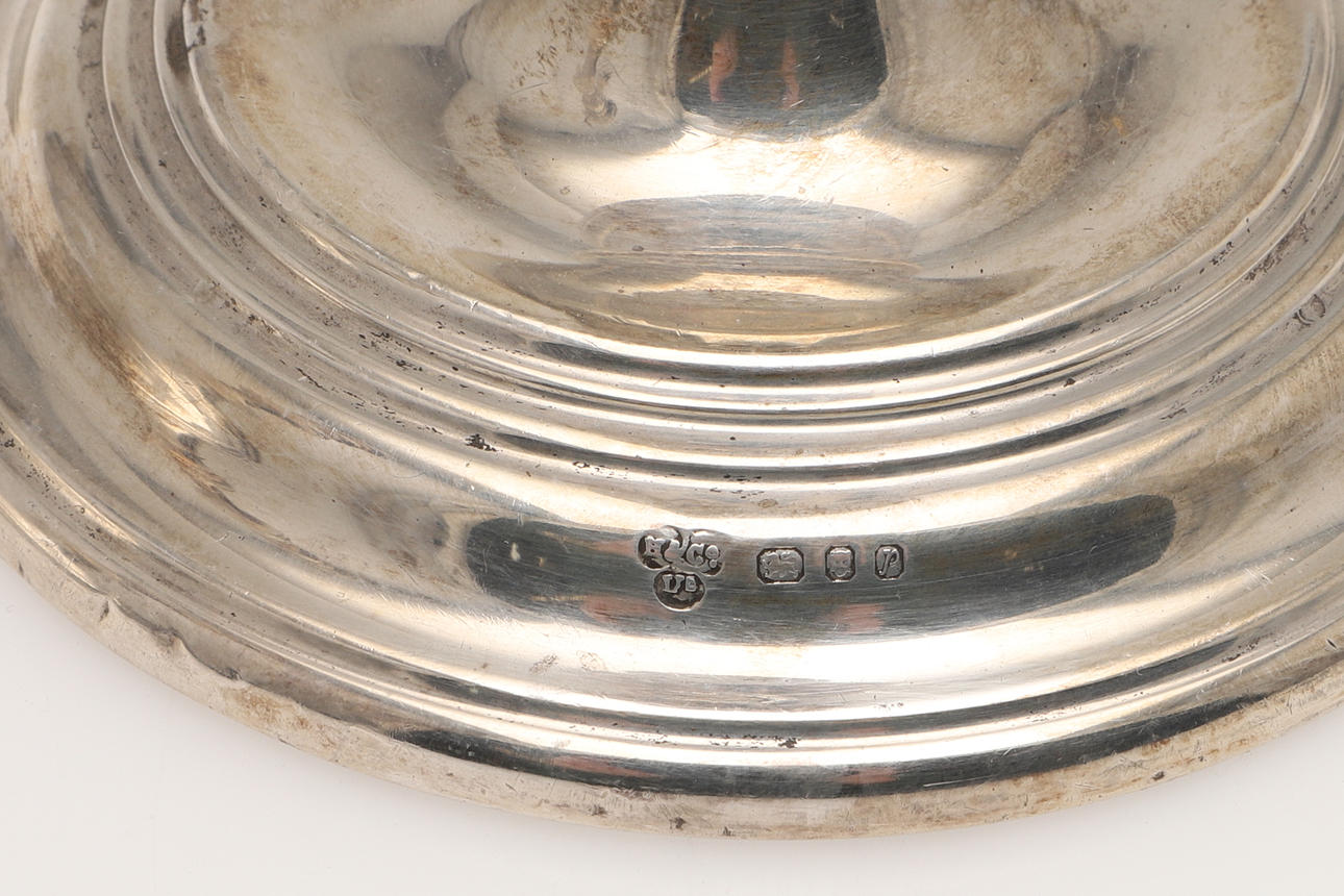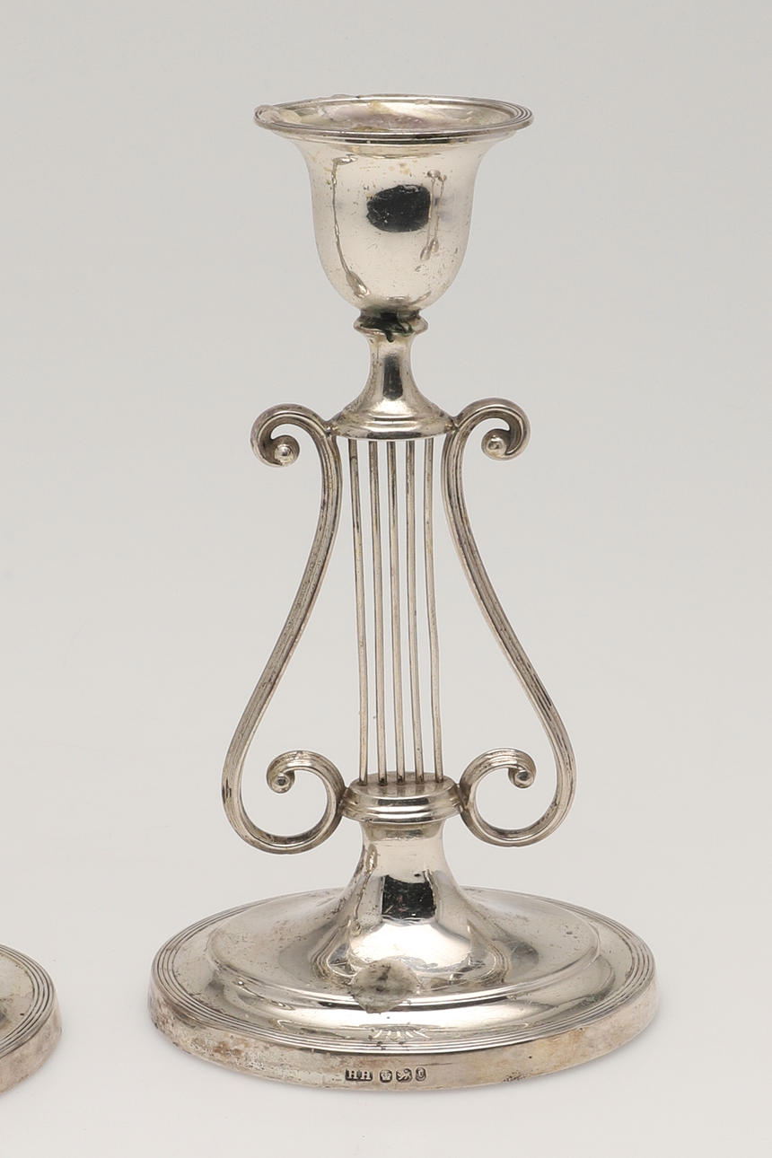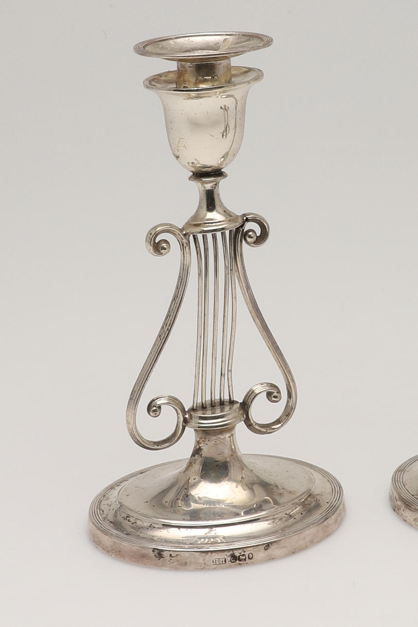 ett Elizabeth II cirkulärt par med vassbårder och knutna stjälkar, av Heming & Co, London 1989 och ett ovalt par med lyrstöd, av Harrison & Howson, Sheffield 1895, båda med laddade baser, det senare paret 8" (20,3 cm) högt (4).